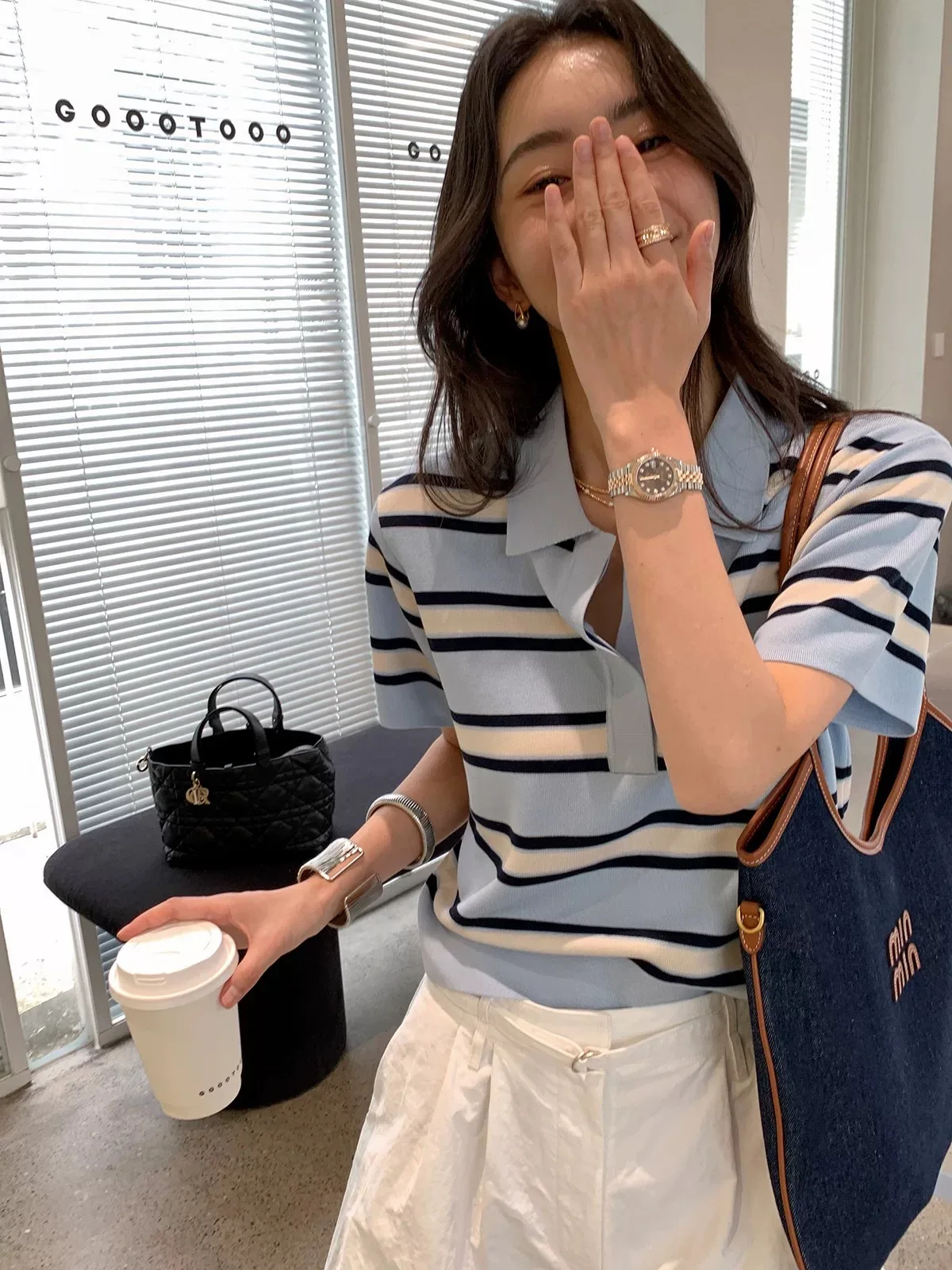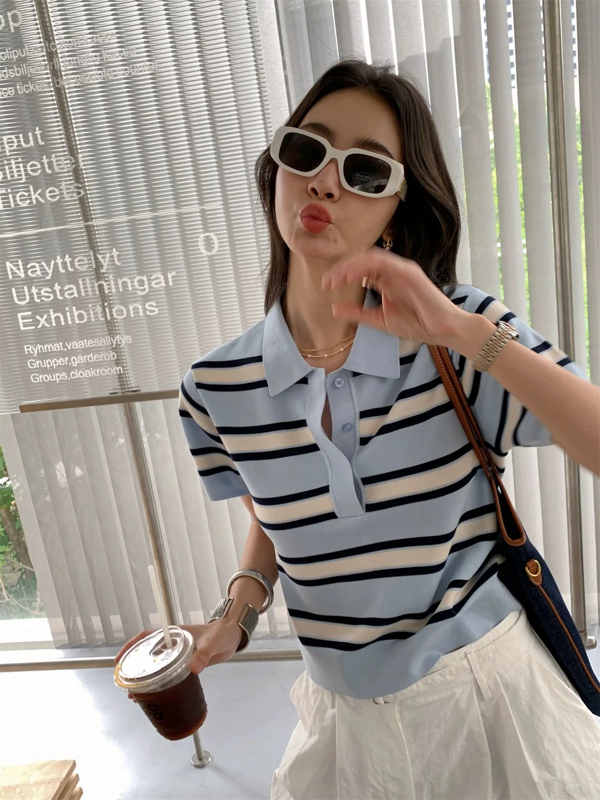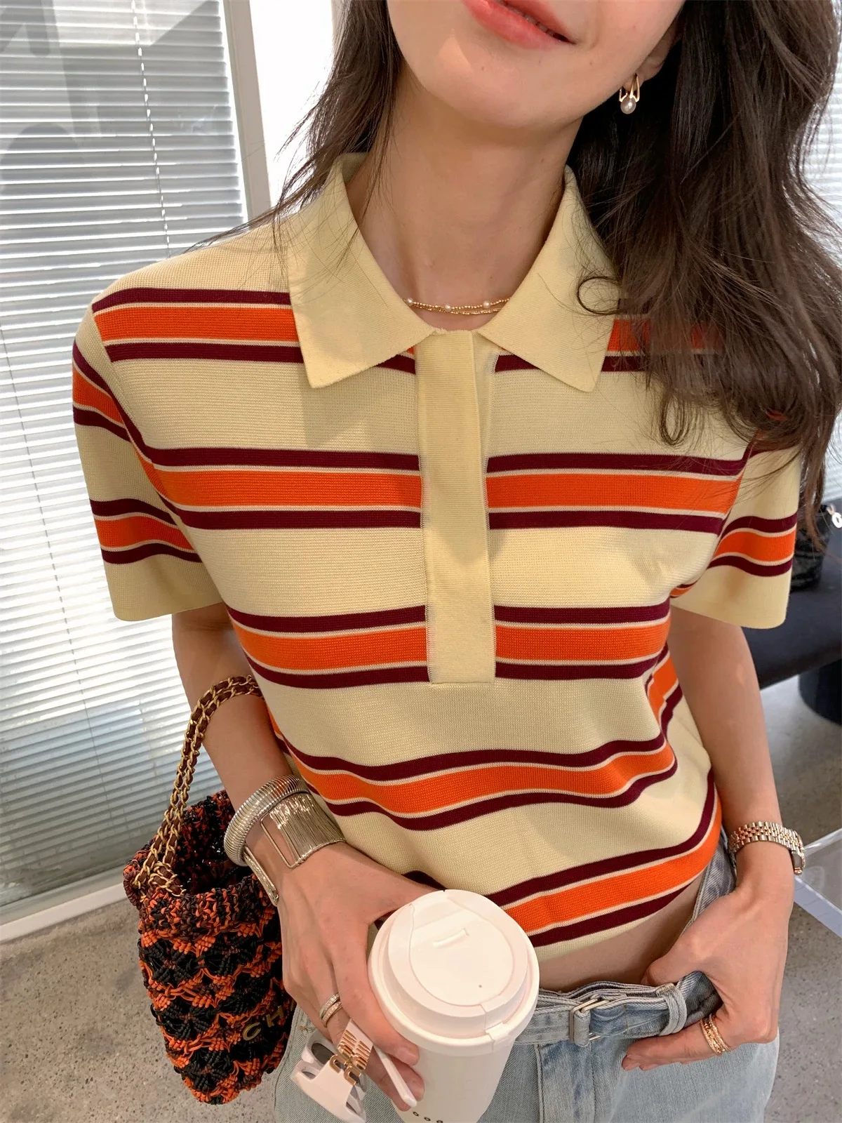 2025 Classic POLO collar Design Pure Lyocell Pullover Women's knitted Short sleeves Sweater High-quality Multi-color Stripes Top