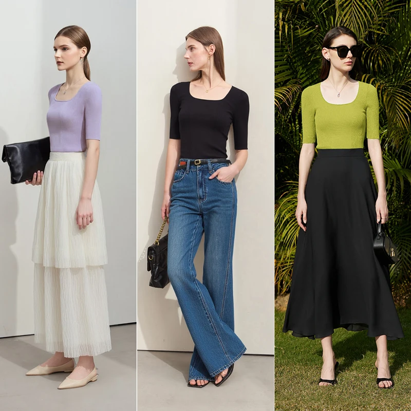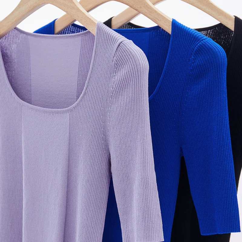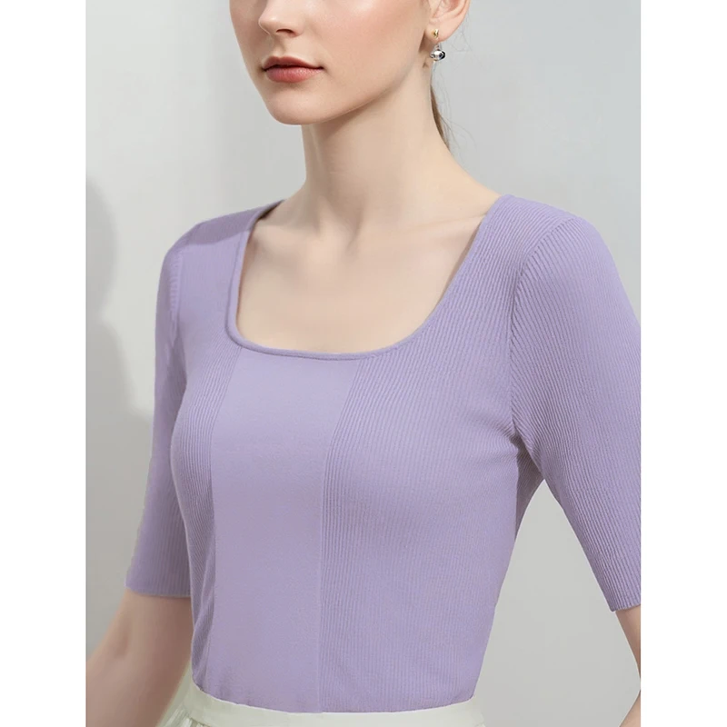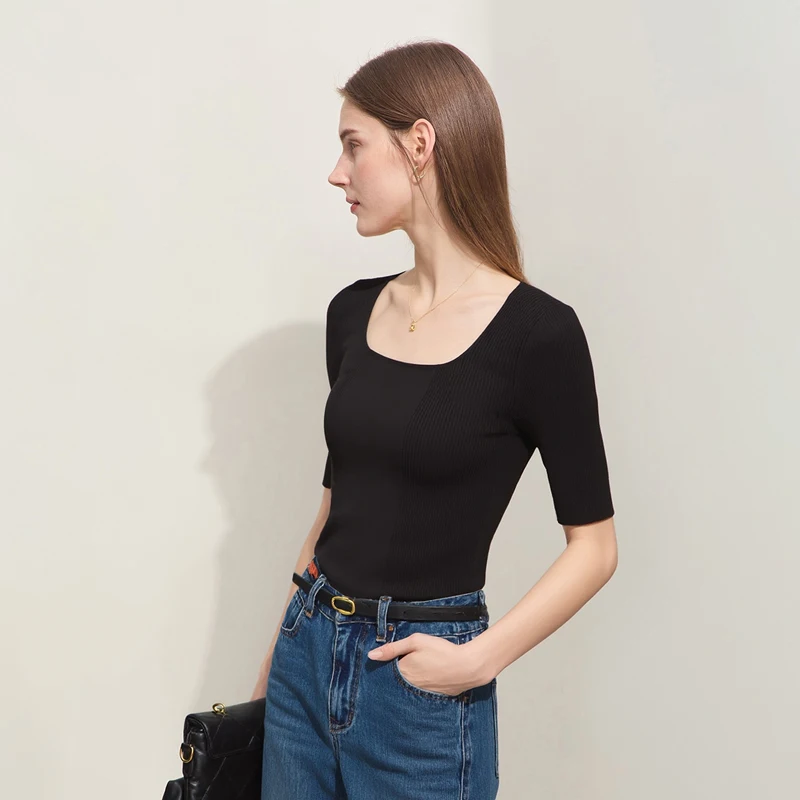 Amii Women's Knit Top 2026 Summer Slim Ribbed Mid-Sleeve Sweater Pullover French Square Neck Casual Jumper for Women 12612012