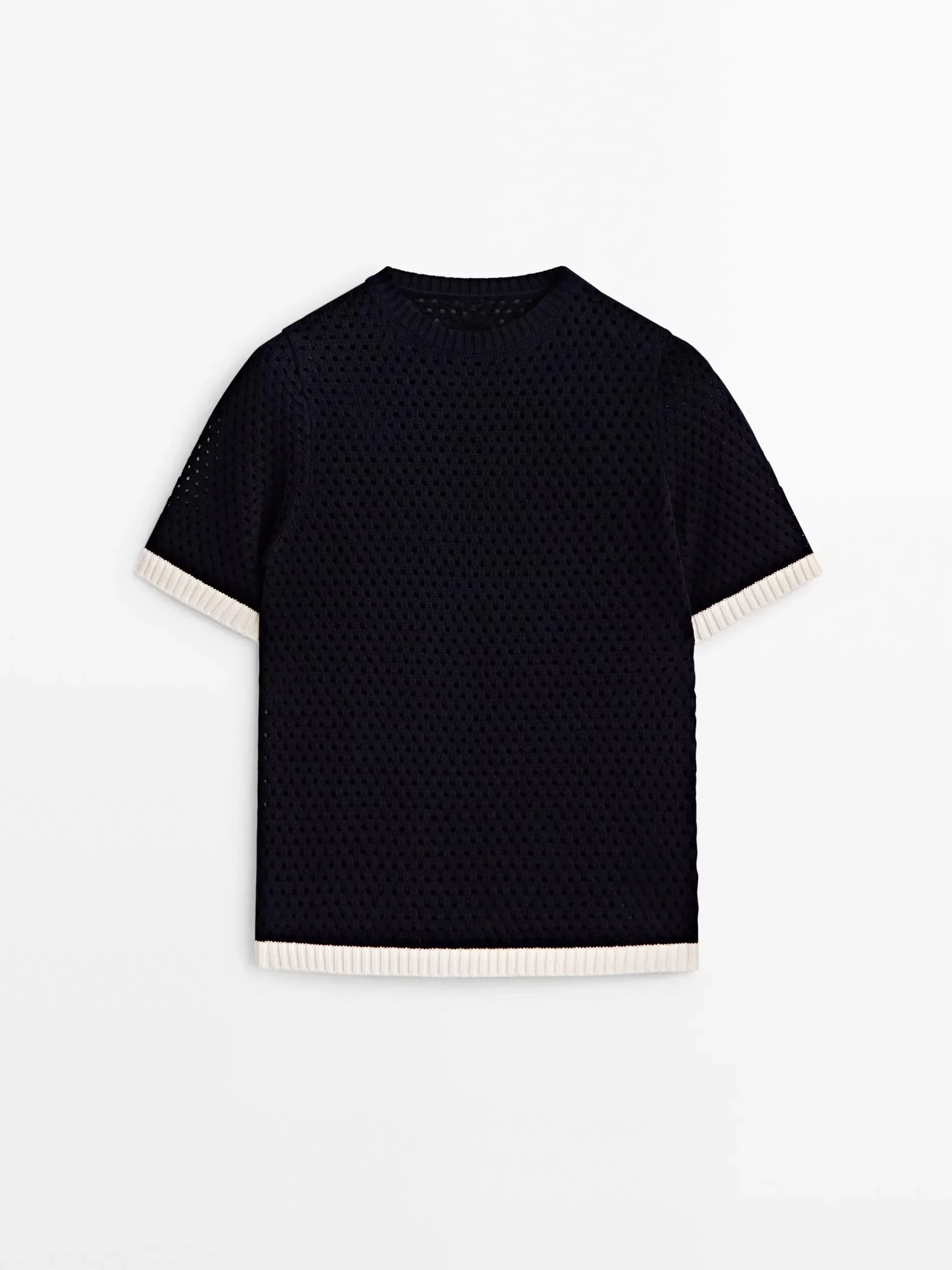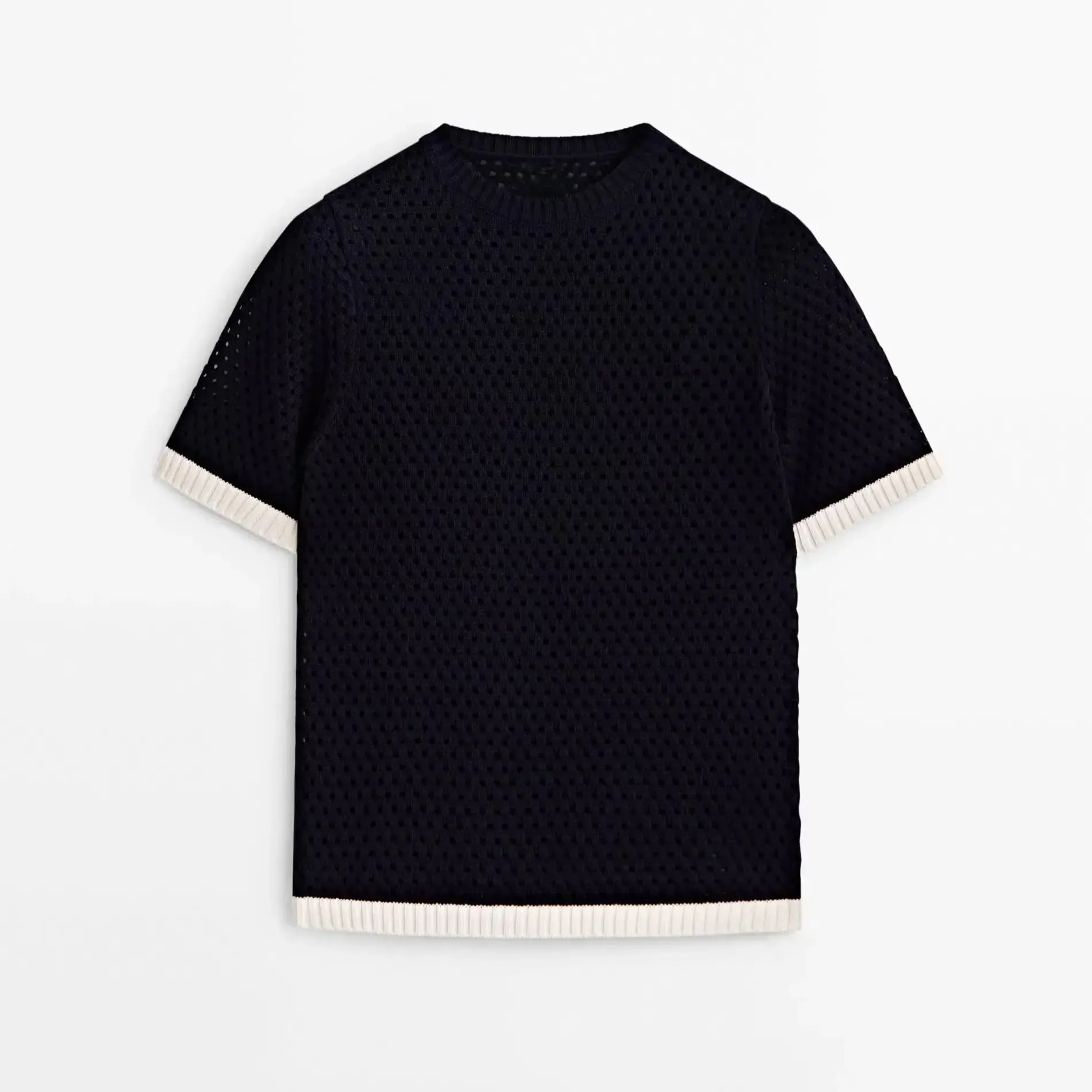 Ethereal MD 2026 YAZHIMEI new style of Small fragrance style splicing hollow hollow pure cotton short-sleeved crew-neck sweater