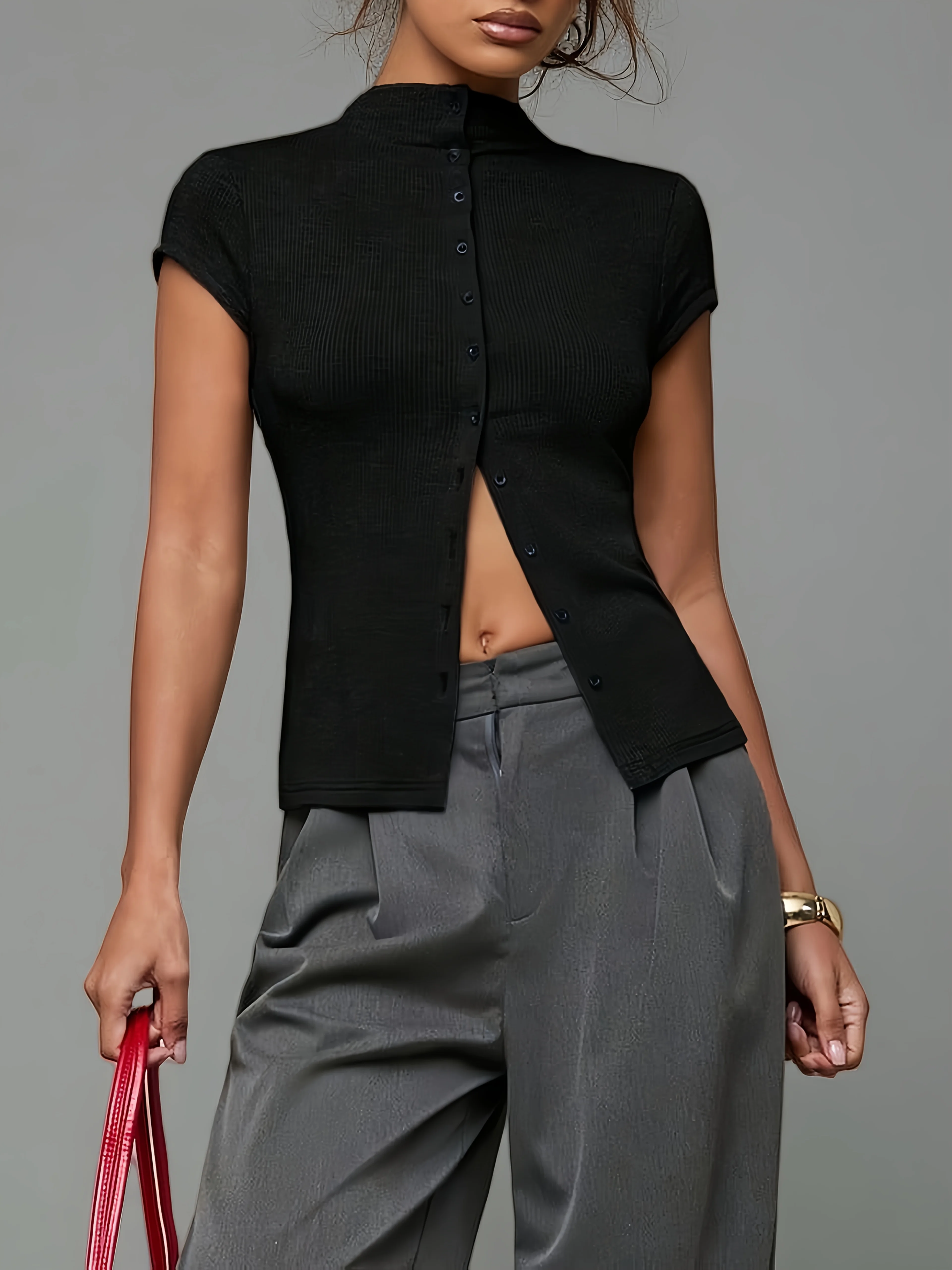 Women's fashionable knitted turtleneck top, slim and comfortable four-season short-sleeved cardigan, can be worn as a base layer