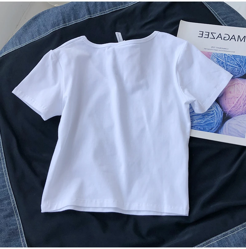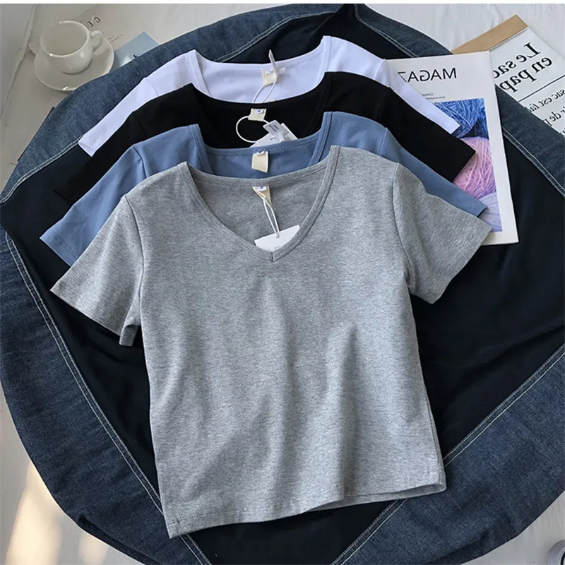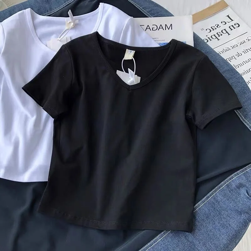 Elegant Pure Color V-Neck Short Sleeve T-Shirt Women's High Waist Top Korean Style Slim Fit Commute Fashion Spring Summer
