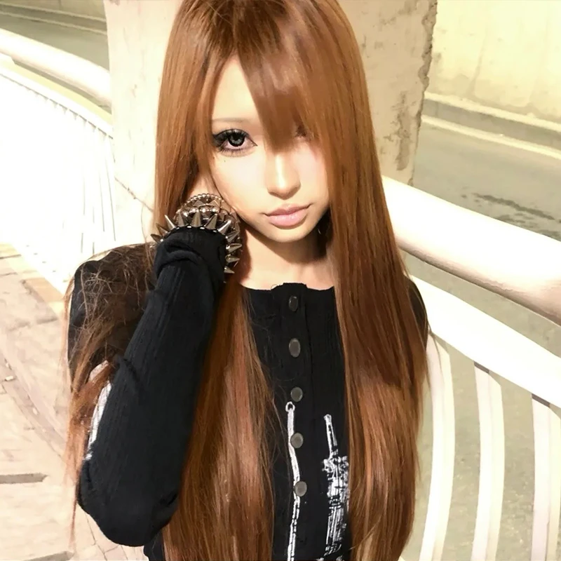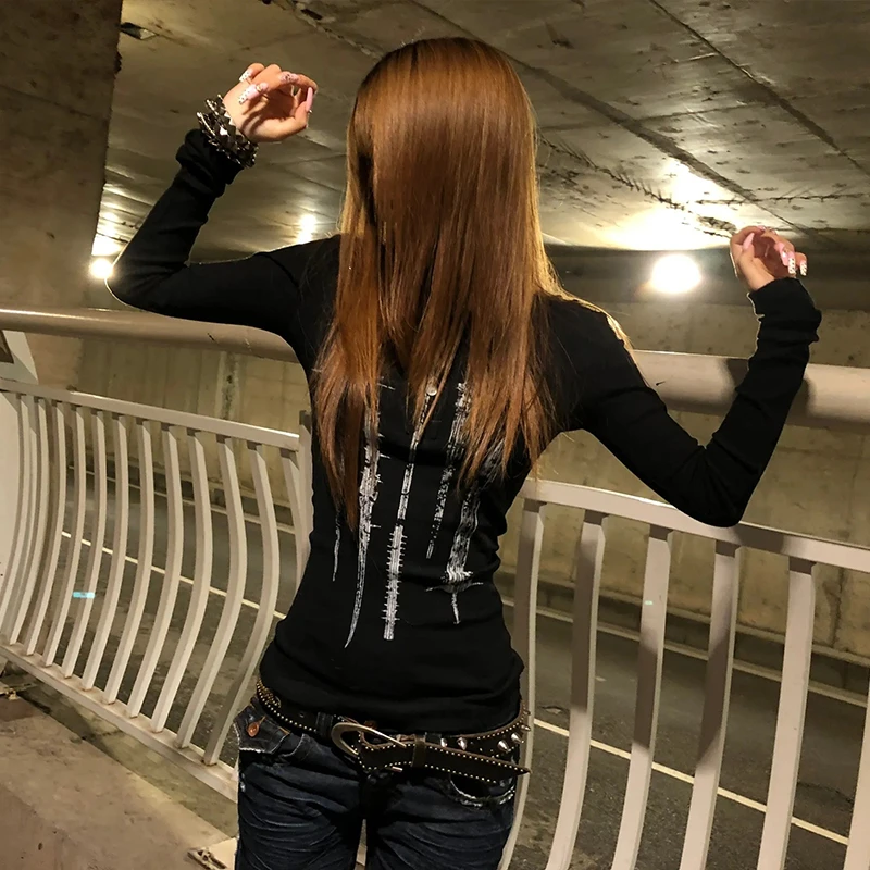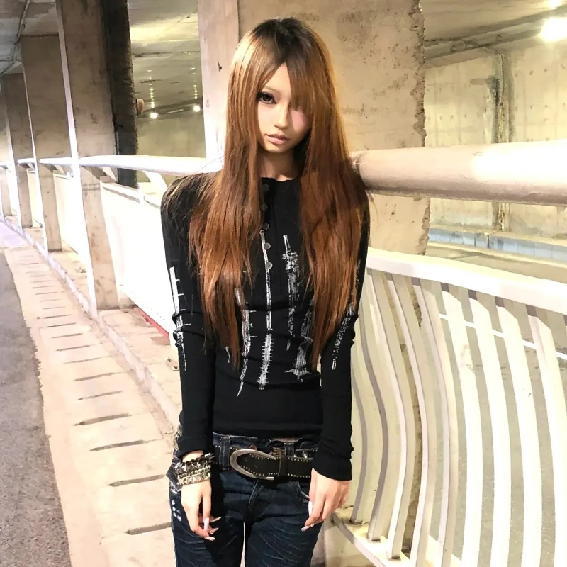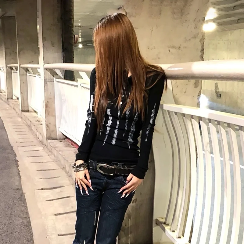 Karrcat Grunge Aesthetics Tattoo Print Knitted Tops Trashy Y2k Long Sleeve Knit T-shirt Vintage Gothic Button Top American Retro