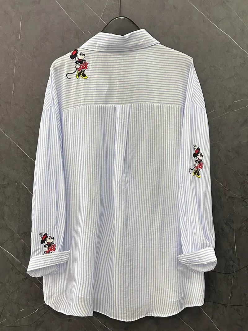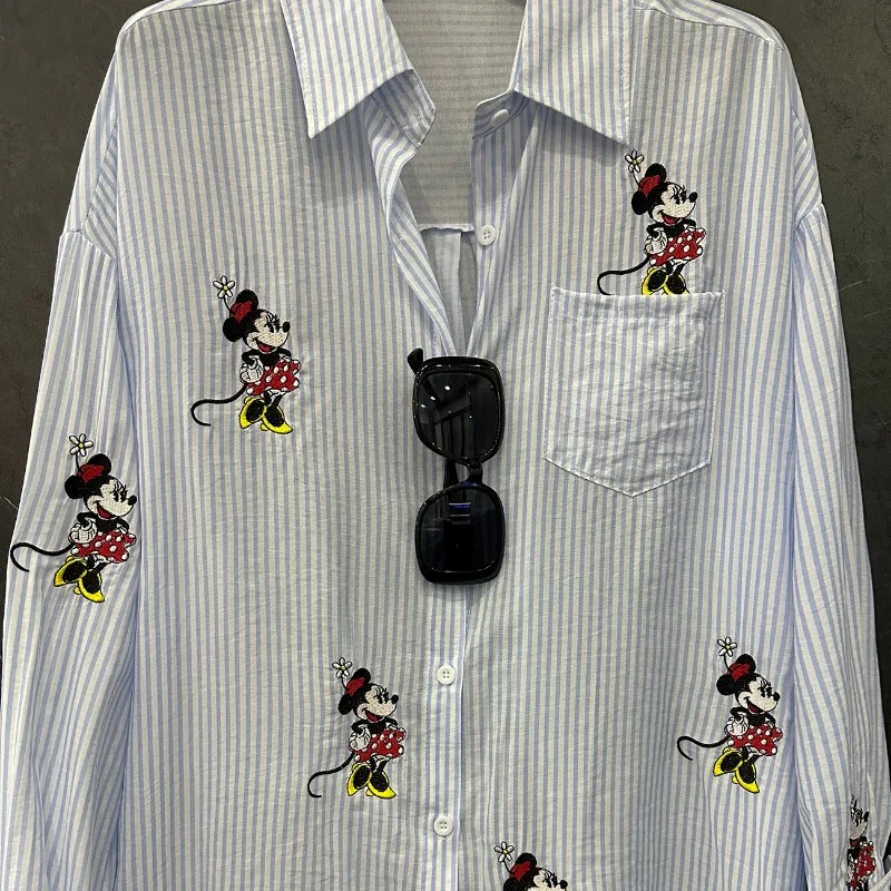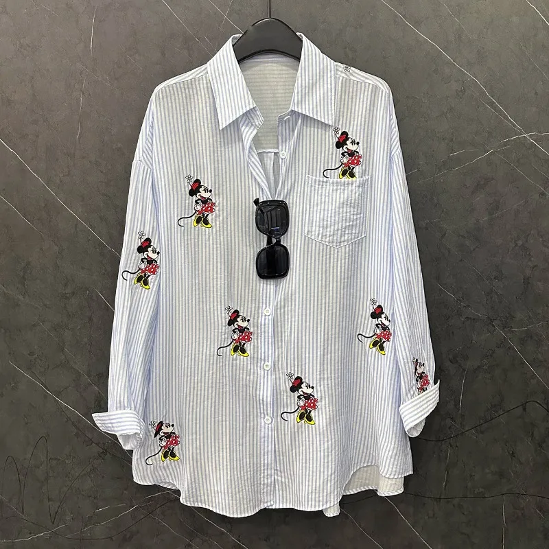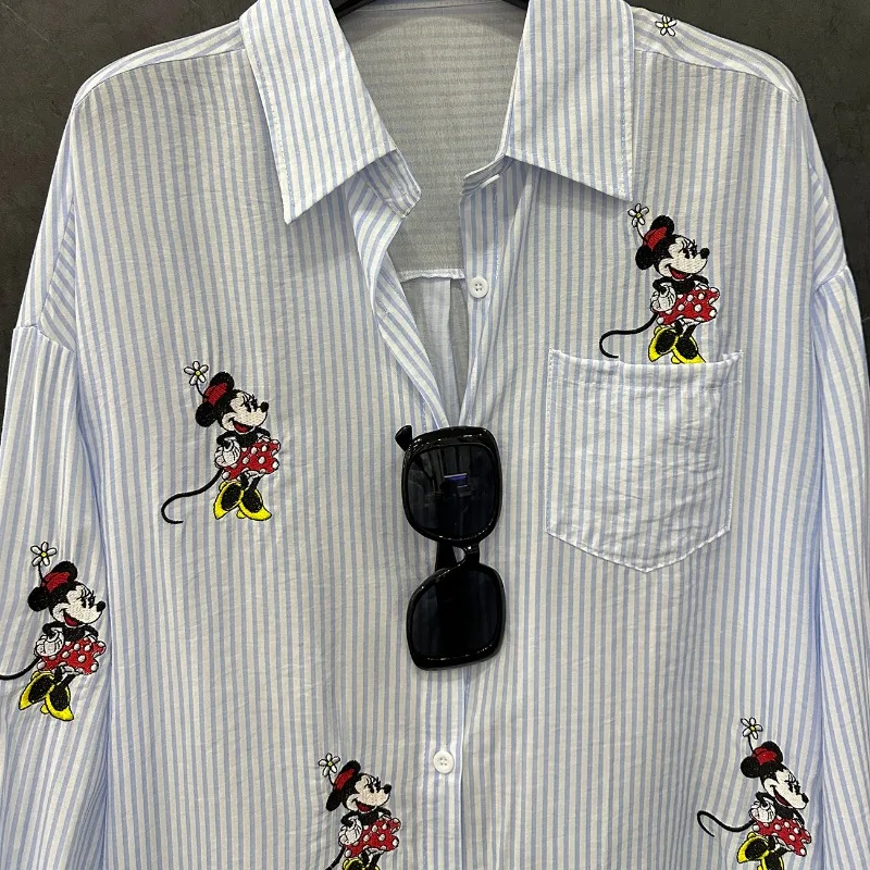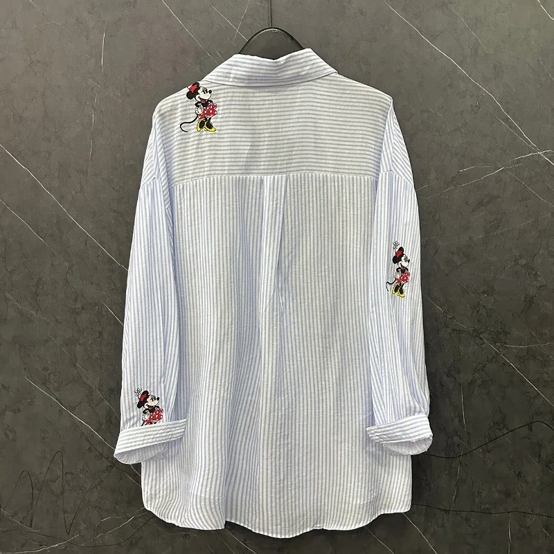 Summer New Kawaii Cute Embroidered Cartoon Long-sleeved Striped Shirt Women's Loose Casual Versatile Medium And Long Top Blusas