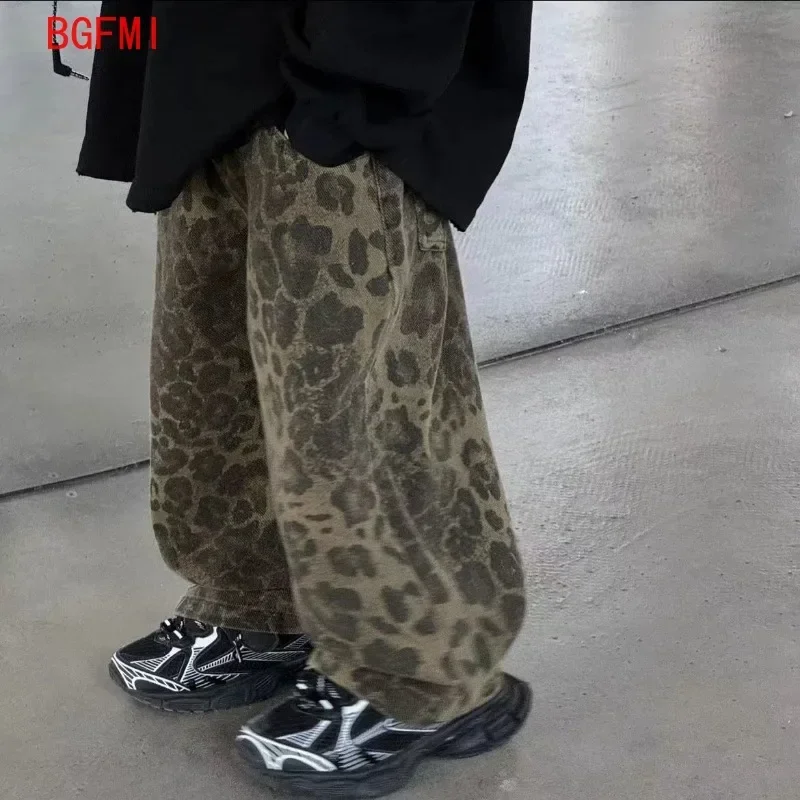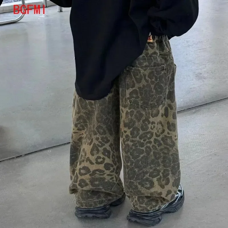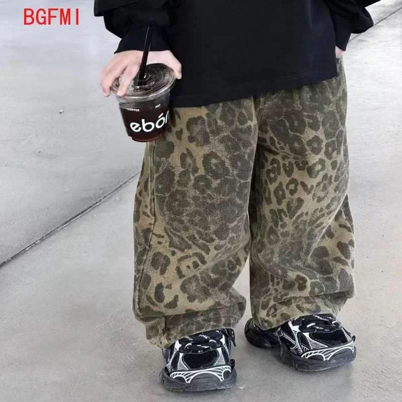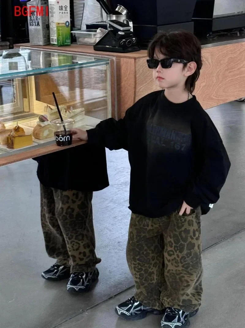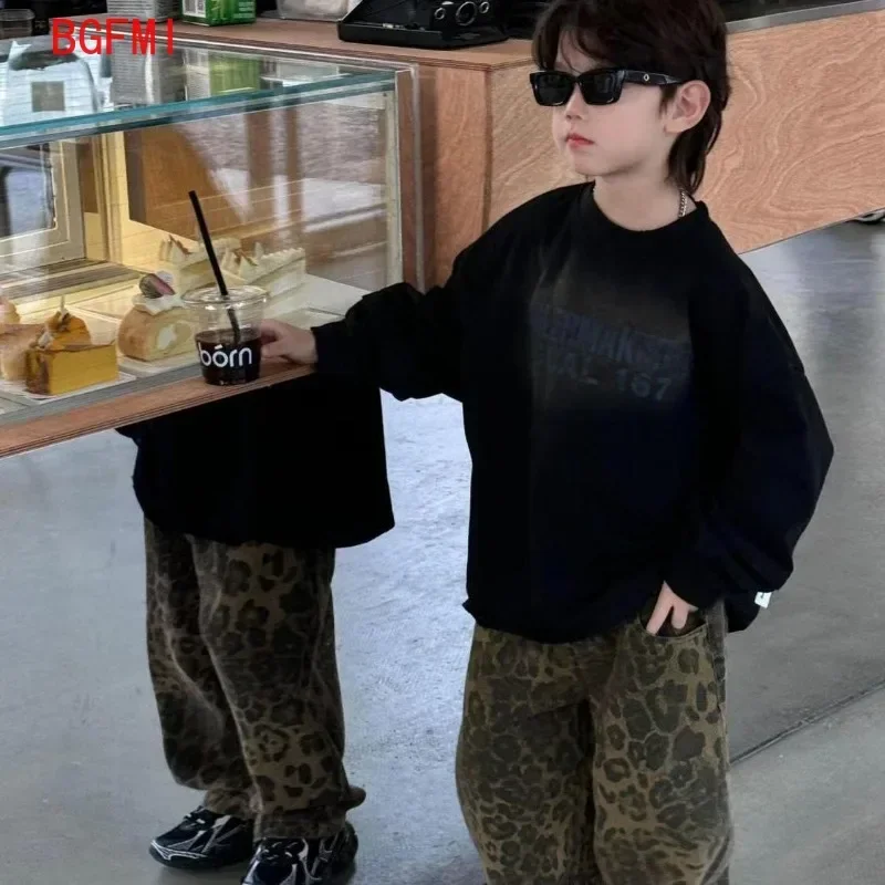 בנים 2025 אביב סתיו חדש קוריאני ילדים שחור אות סווטשירט + ליאופרד וינטאג' ג'ינס מכנסיים מתרחבים סט אופנה לילדים
