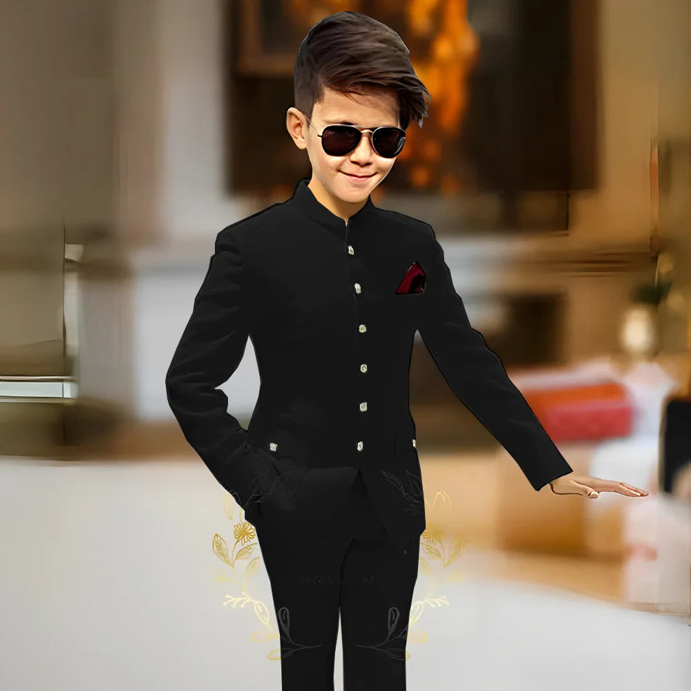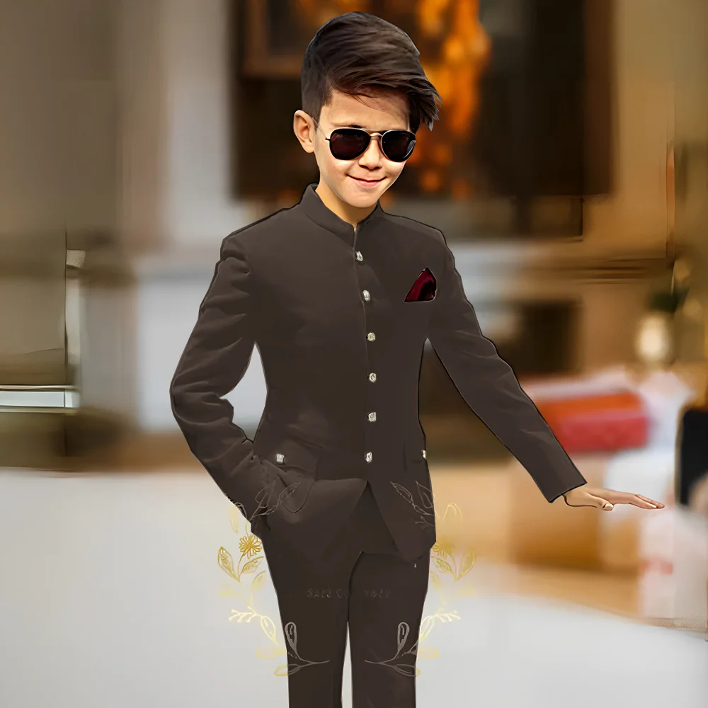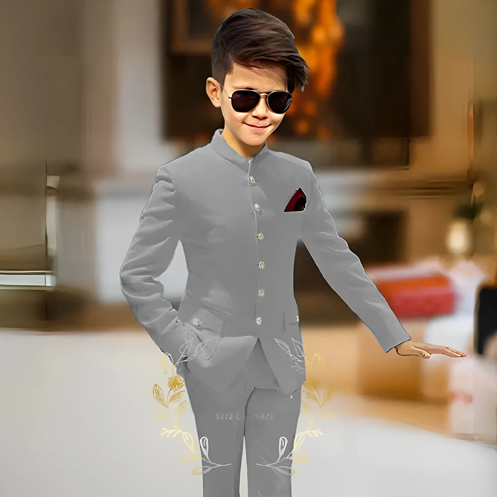 חליפות ילדים למסיבת בנים 2 חלקים עיצוב אחרון עם צווארון עומד וכפתורים זהב חליפות אופנה למסיבת חתונה לבנים