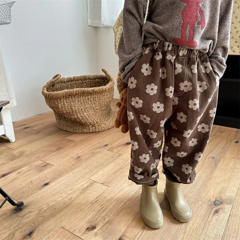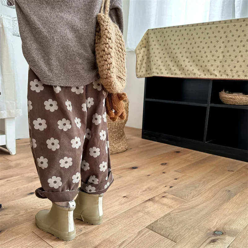 מכנסיים רחבים חדשים לילדים בסגנון וינטאג' עם הדפס פרחים לבנות, מכנסי הארם לתינוקות וילדים, מכנסי כותנה לתינוקות