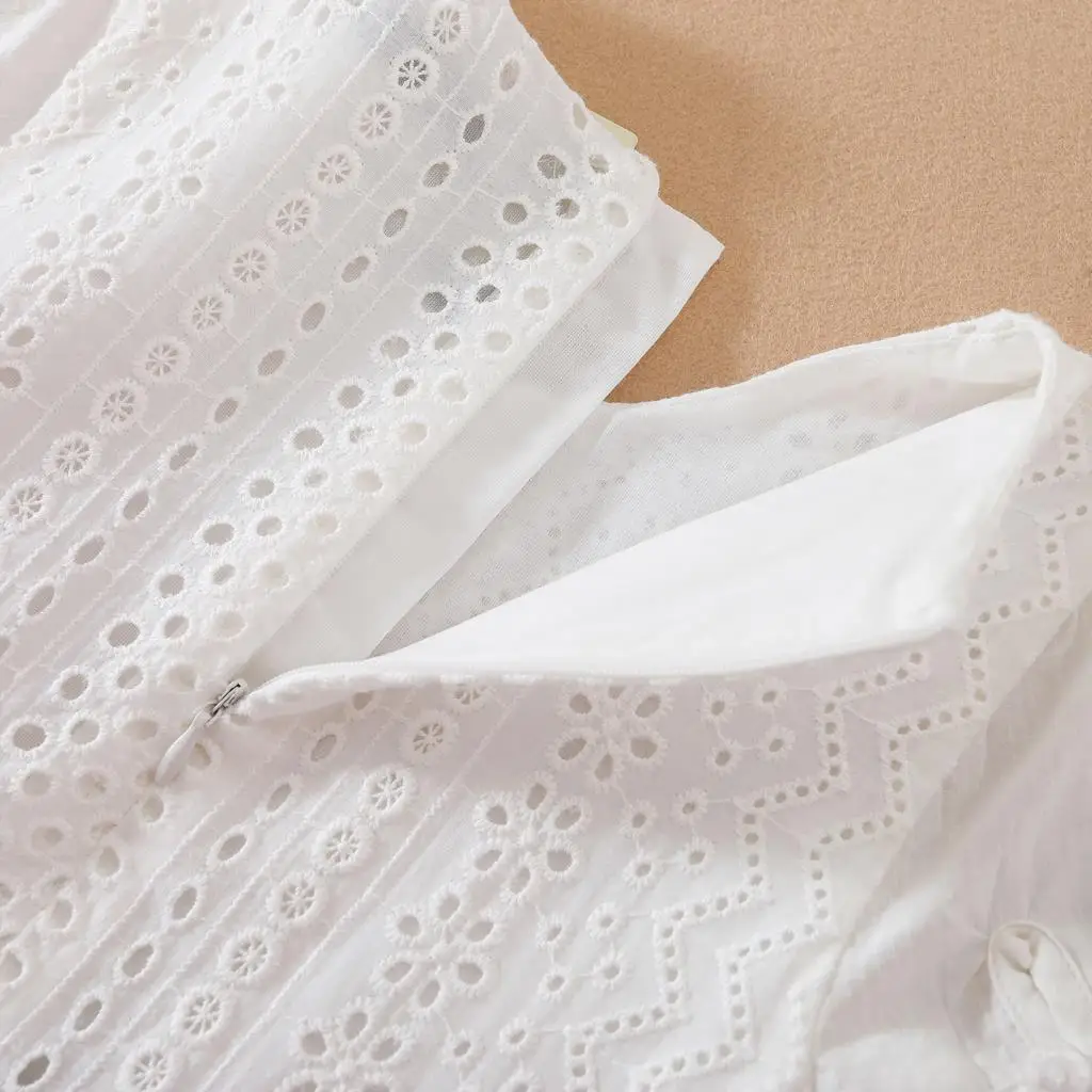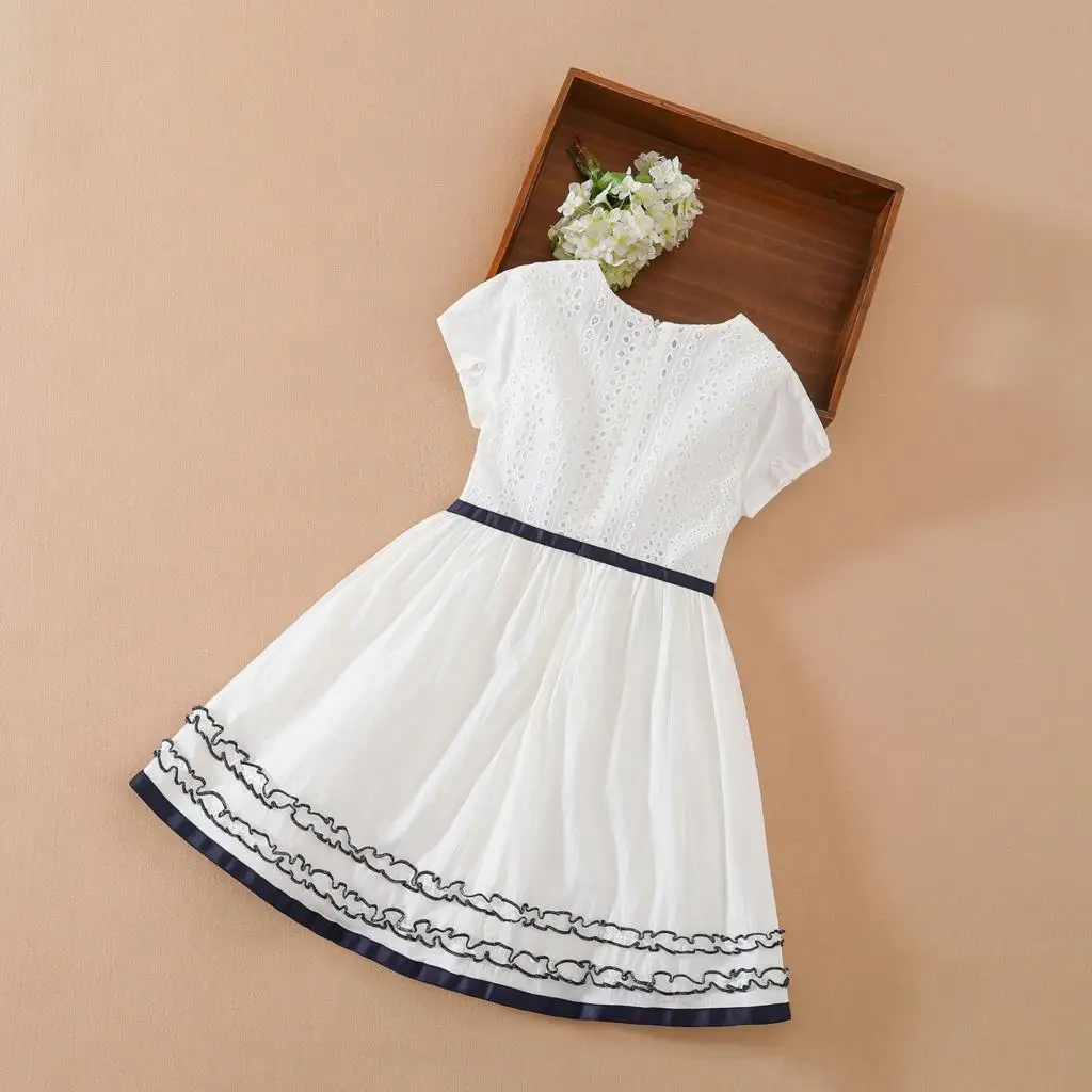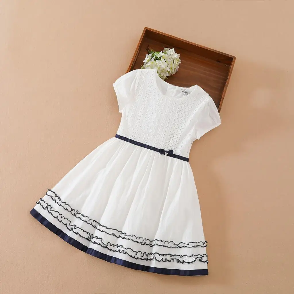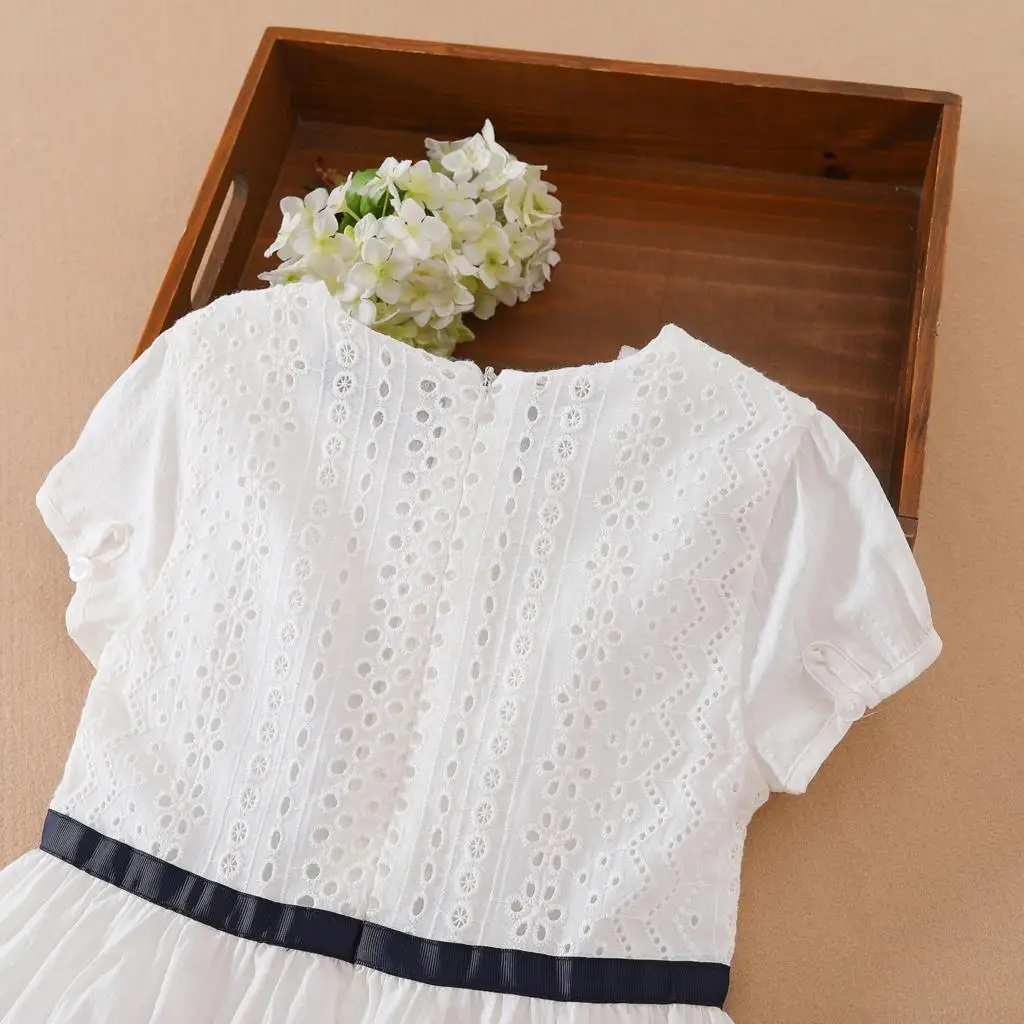 שמלת פרחים לבנה עם מחשוף עגול מבד כותנה לילדות, בגדי חתונה לילדות תינוקות, שמלת נסיכה עם שרוול קצר
