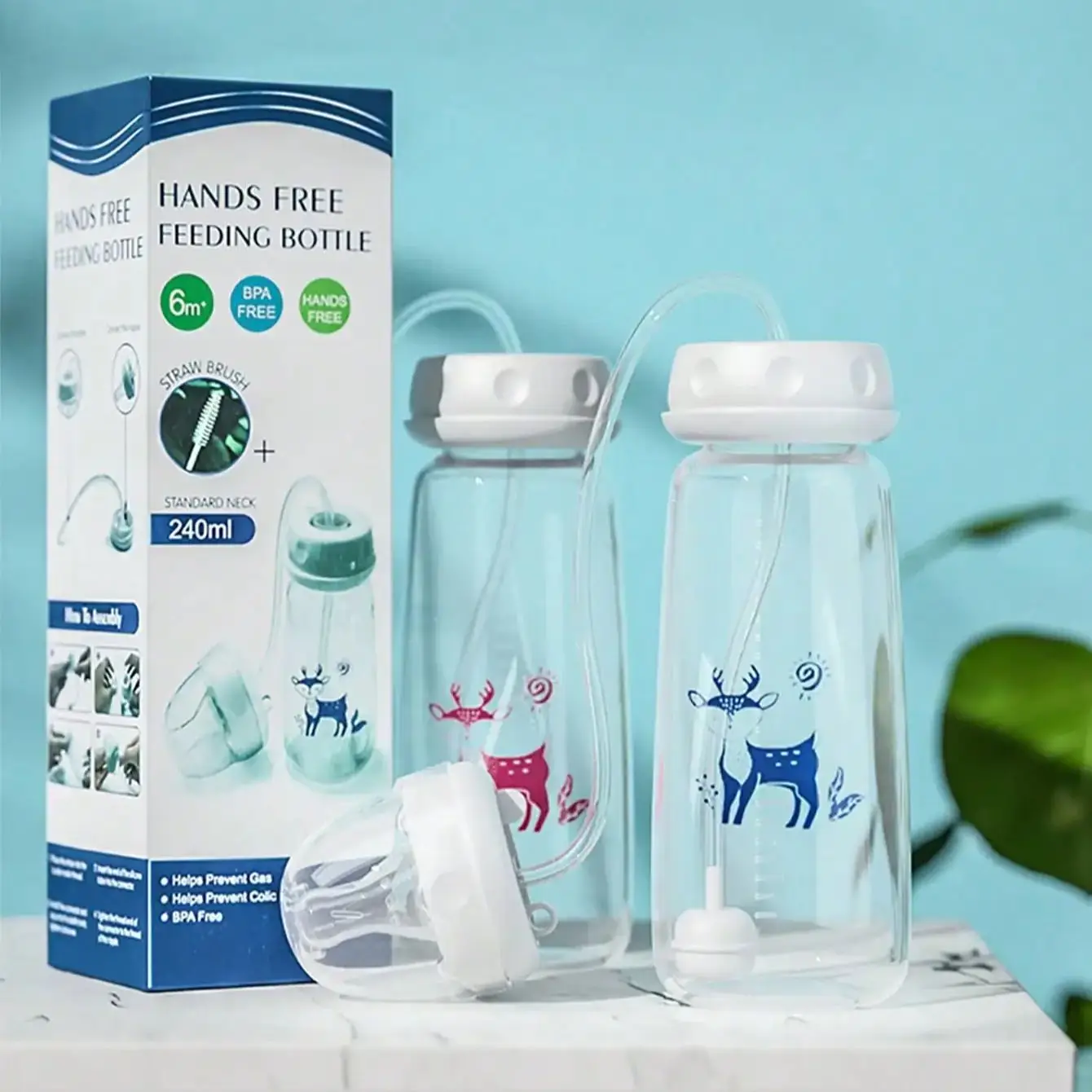 בקבוק תינוק עם צוואר רגיל בנפח 8 אונקיות / 240 מיליליטר עם מברשת קש, סט בקבוקי האכלה PP ללא ידיים - האכלה קלה