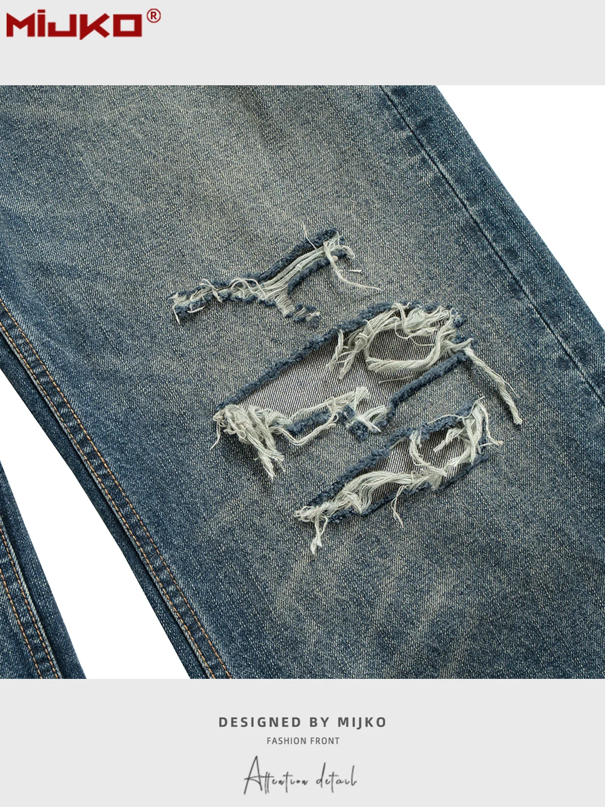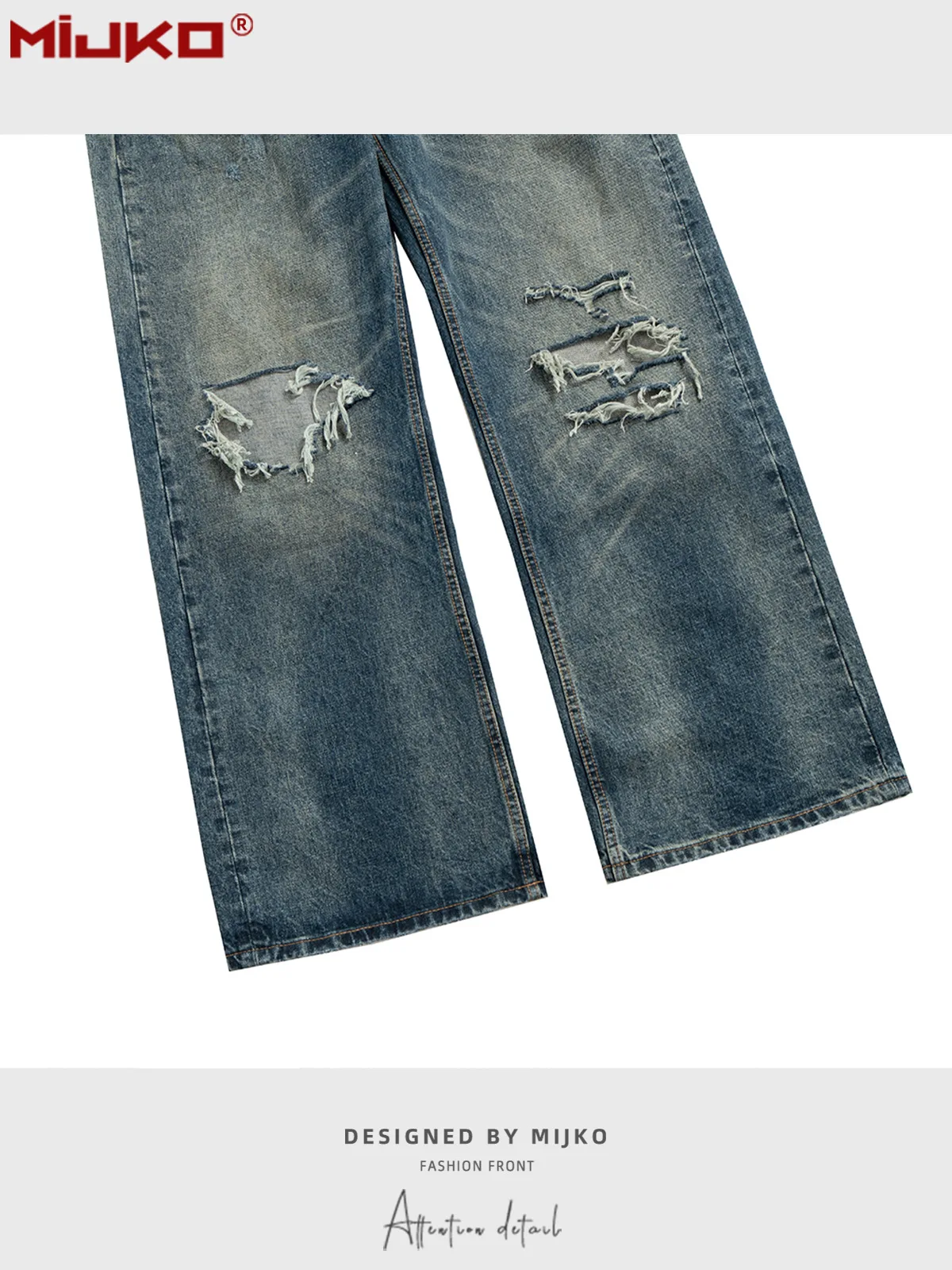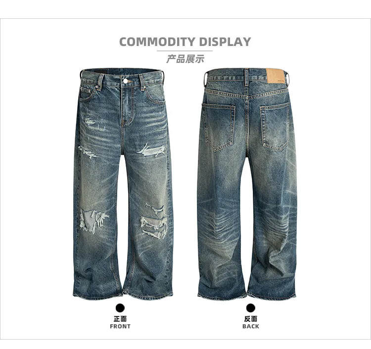 ג'ינס כחול עם חורים בגזרה ישרה וקרועה לגברים מבוגרים בסגנון רטרו #