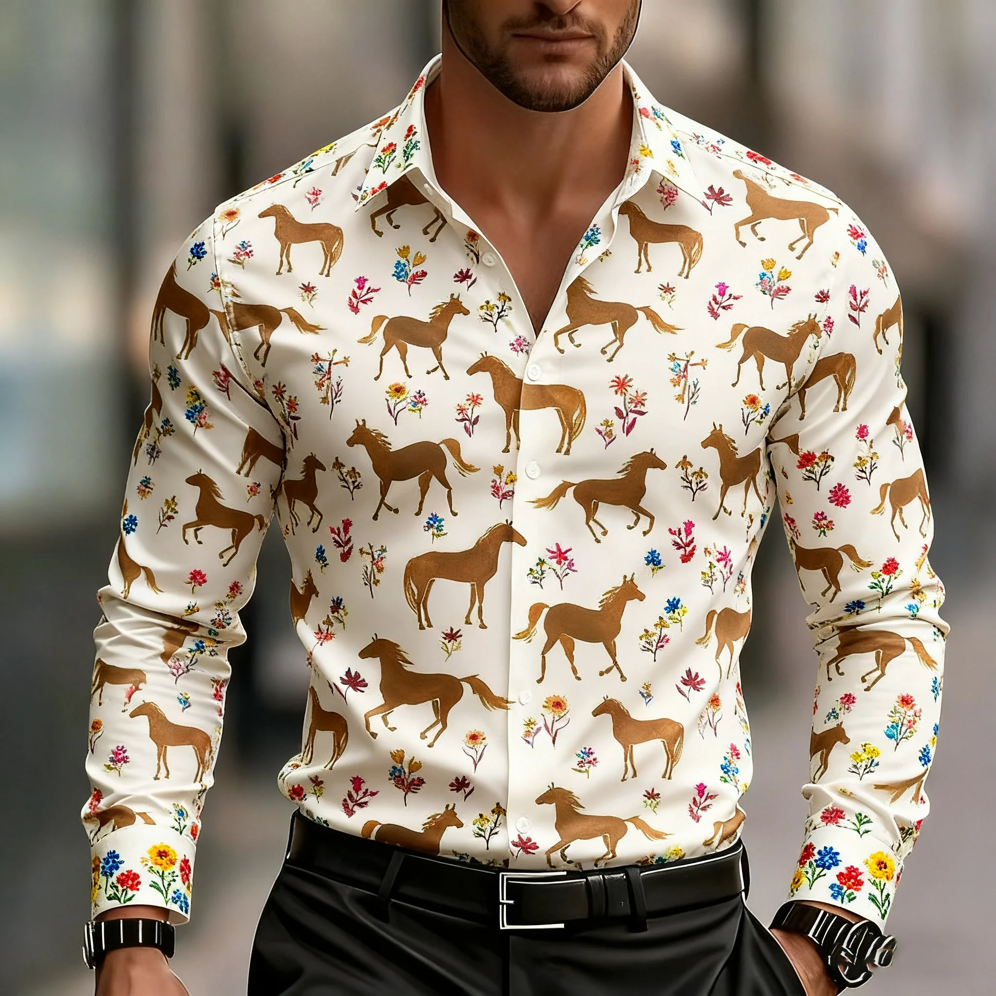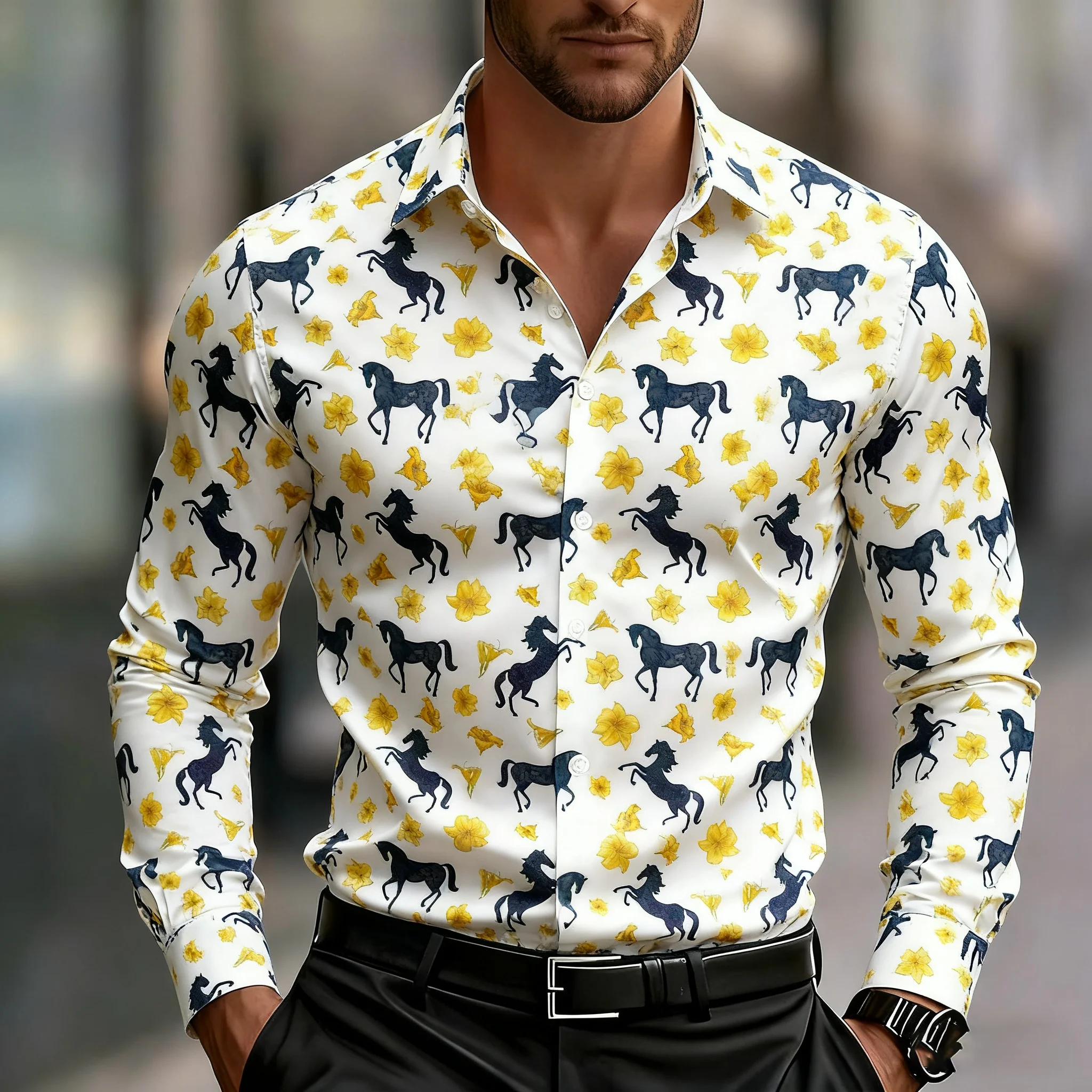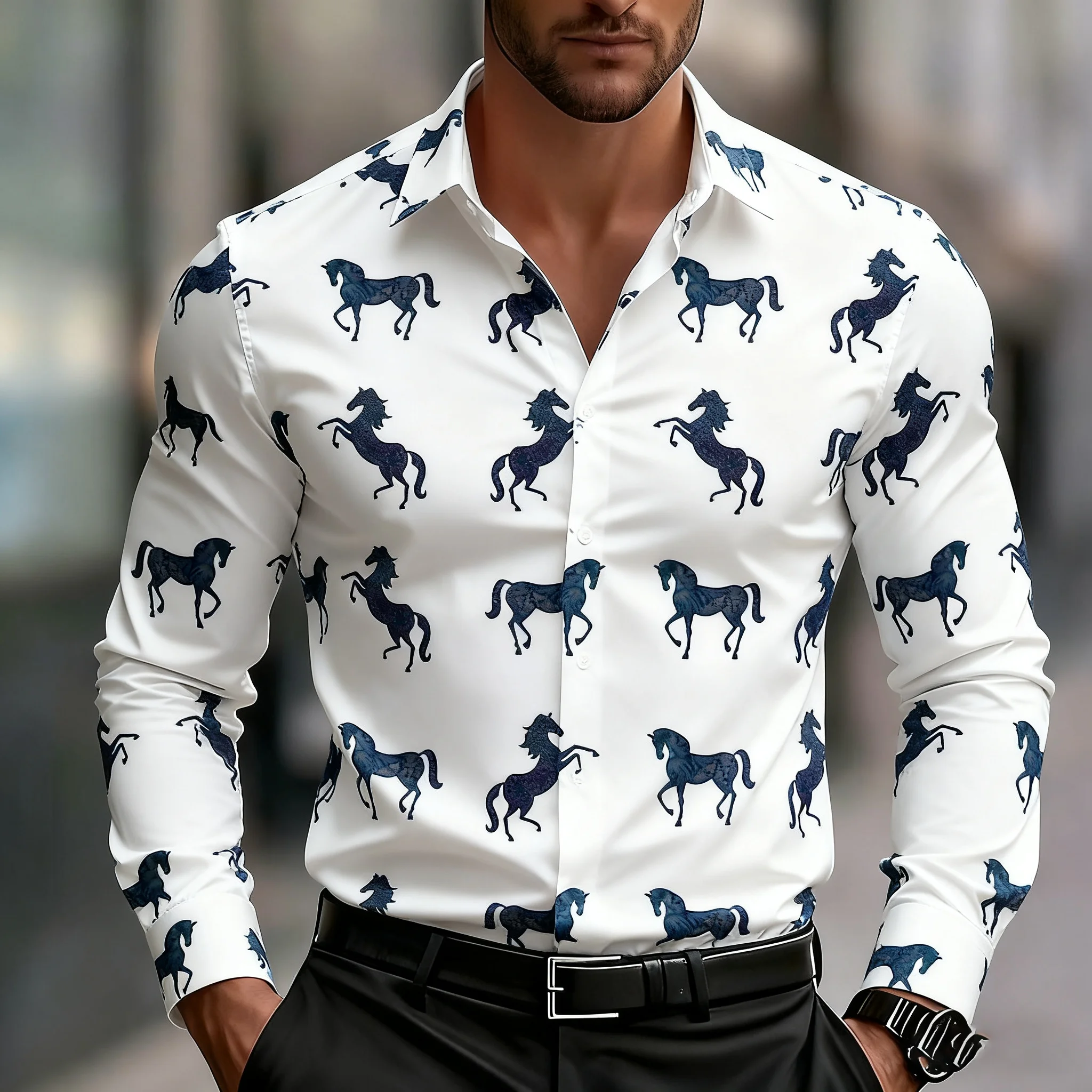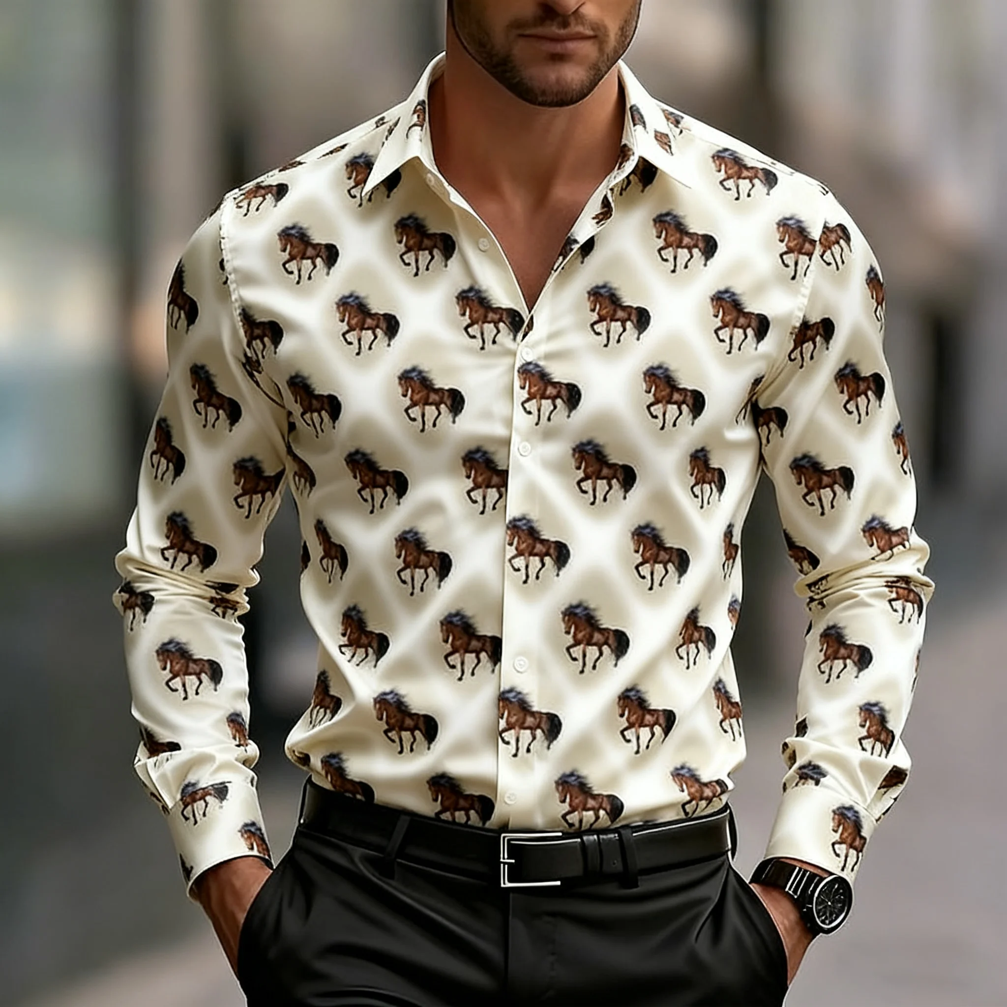 חולצת גיאומטריה עם שרוולים ארוכים לגברים, דוגמת סוס רטרו מגניבה, נוחה ללבישה יומיומית במשרד, חולצת גברים עם צווארון