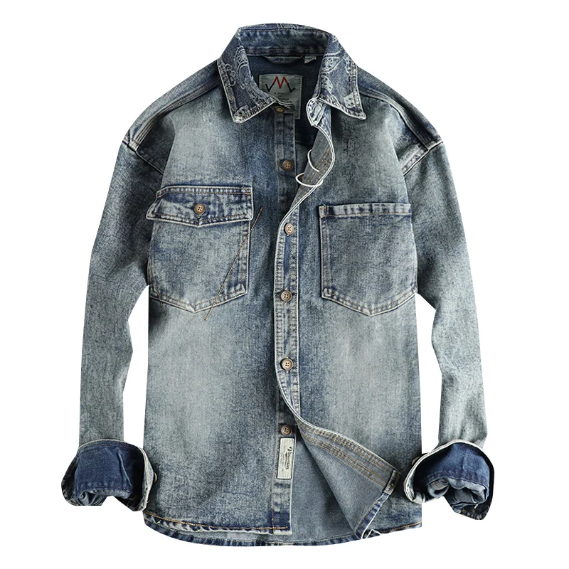 2024 הסתיו והחורף החדש האמריקאי רטרו שרוול ארוך דש ג 'ינס אופנה גברים כותנה טהורה שנשטף מרובי כיס ישן