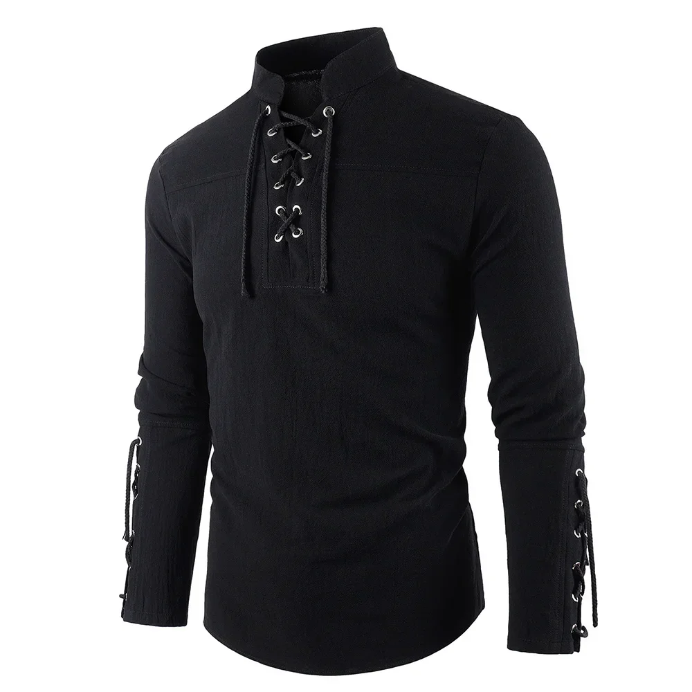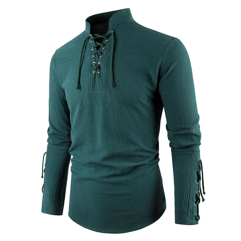 חולצת כותנה ופשתן לגברים בסגנון קז'ואל עם צווארון הנלי ועיצוב עם שרוך למעלה, תחפושת מבצעית למסיבת הלווין בסגנון וינטאג' מודרני