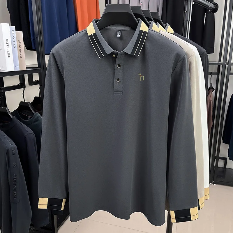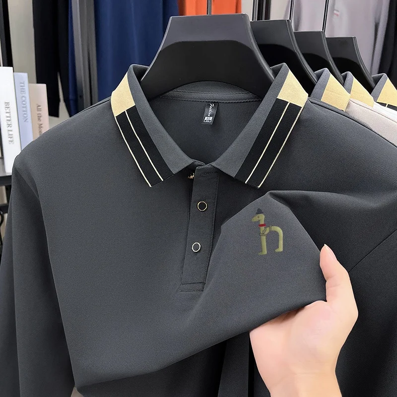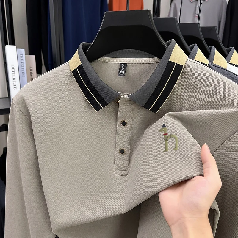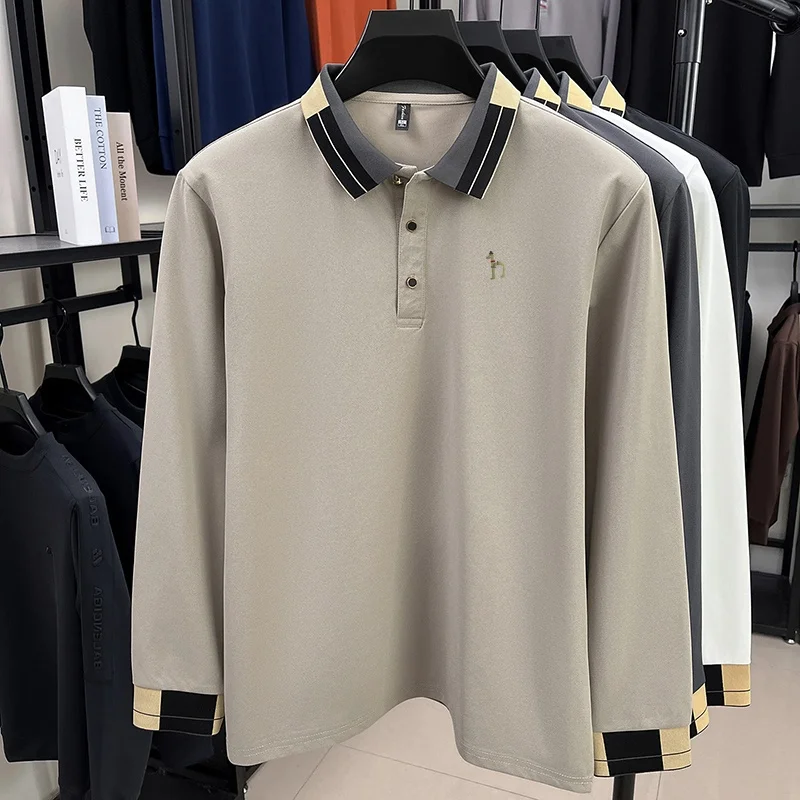 עיצוב מקורי חולצת פולו לגברים סתיו חדש הדפס בצבע אחיד חולצת טריקו עם שרוולים ארוכים בגדי גברים לעסקים פנאי ברמה גבוהה