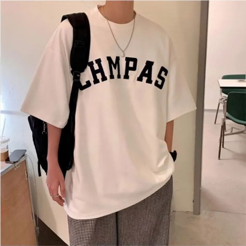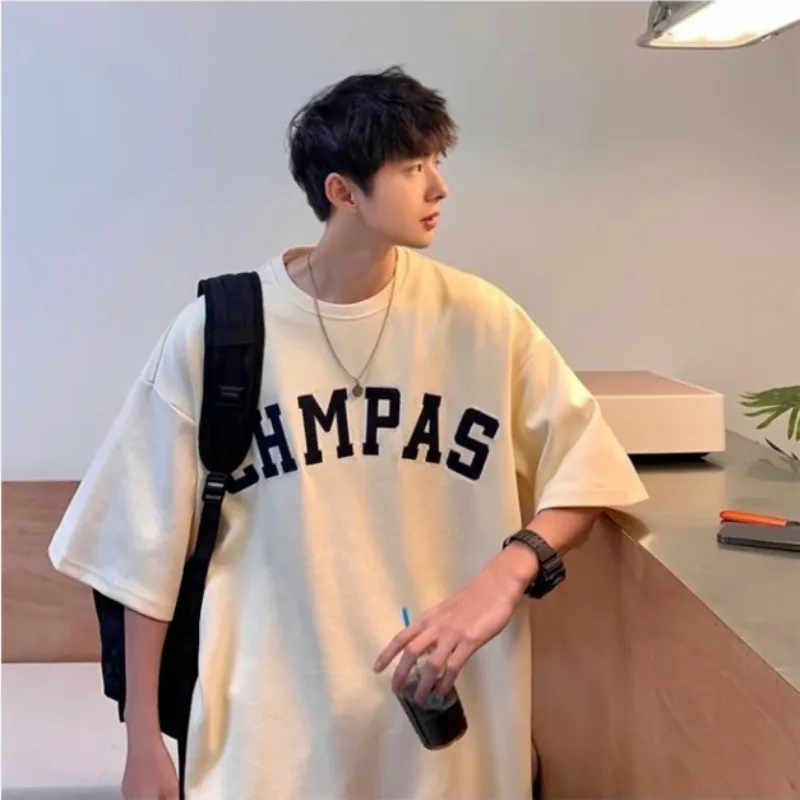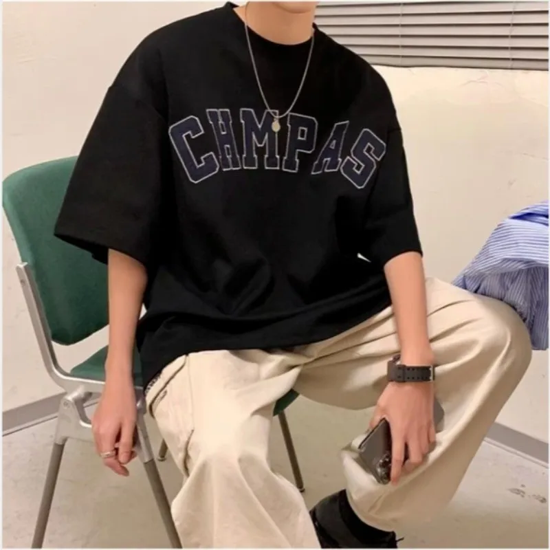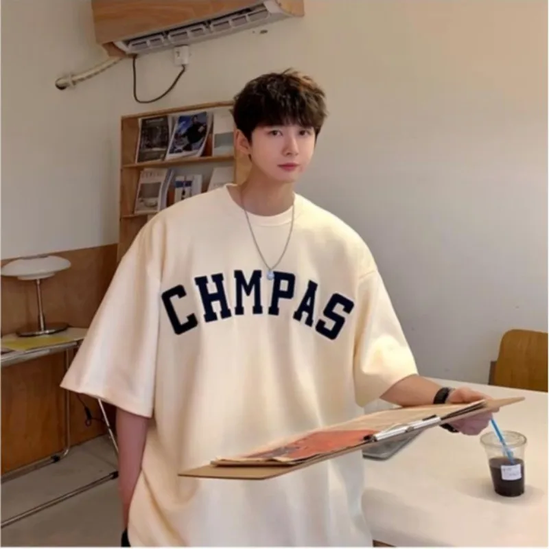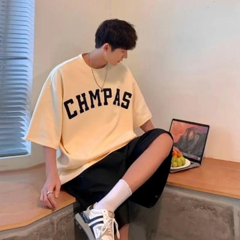 M-8XL גברים בגודל גדול אופנת קוריאה רחבה אמריקאית וינטאג' הדפסת אותיות שרוול קצר צוואר עגול מגוון מגמה זוגית