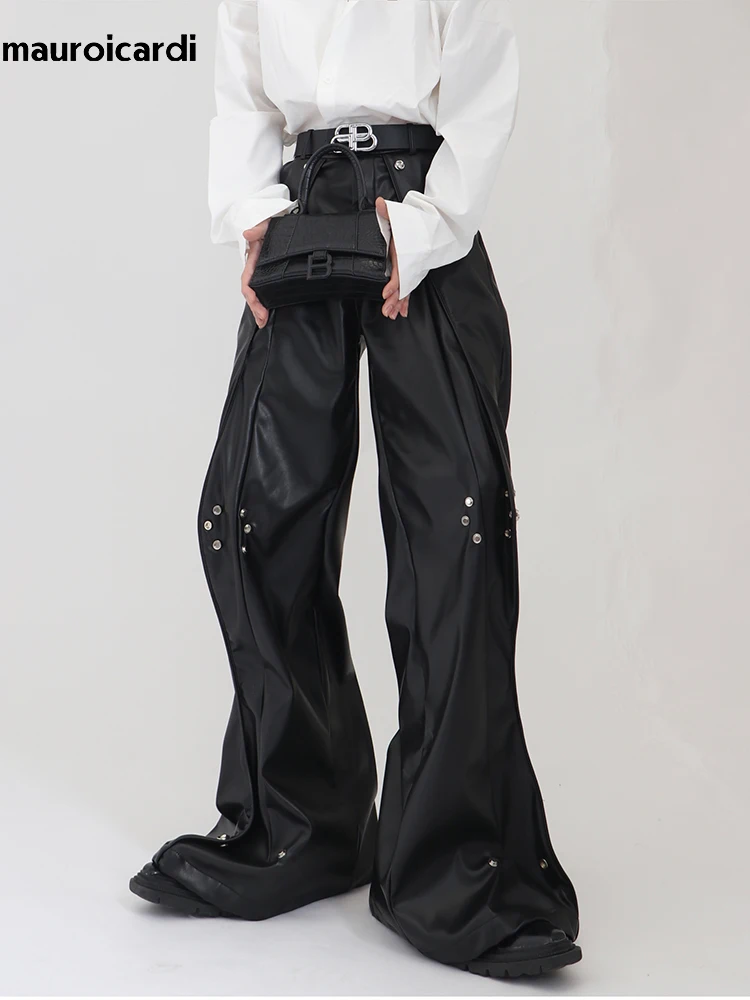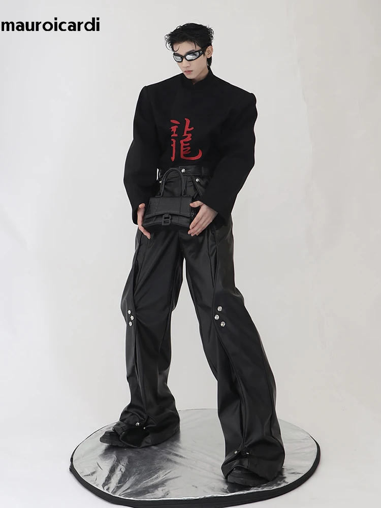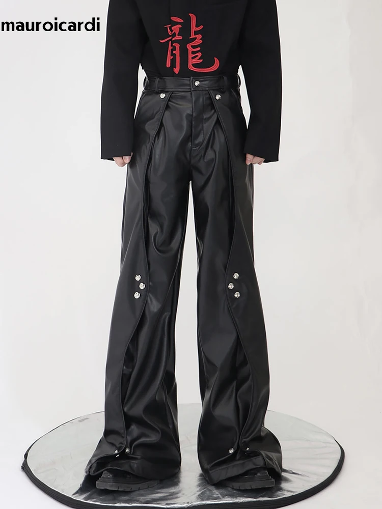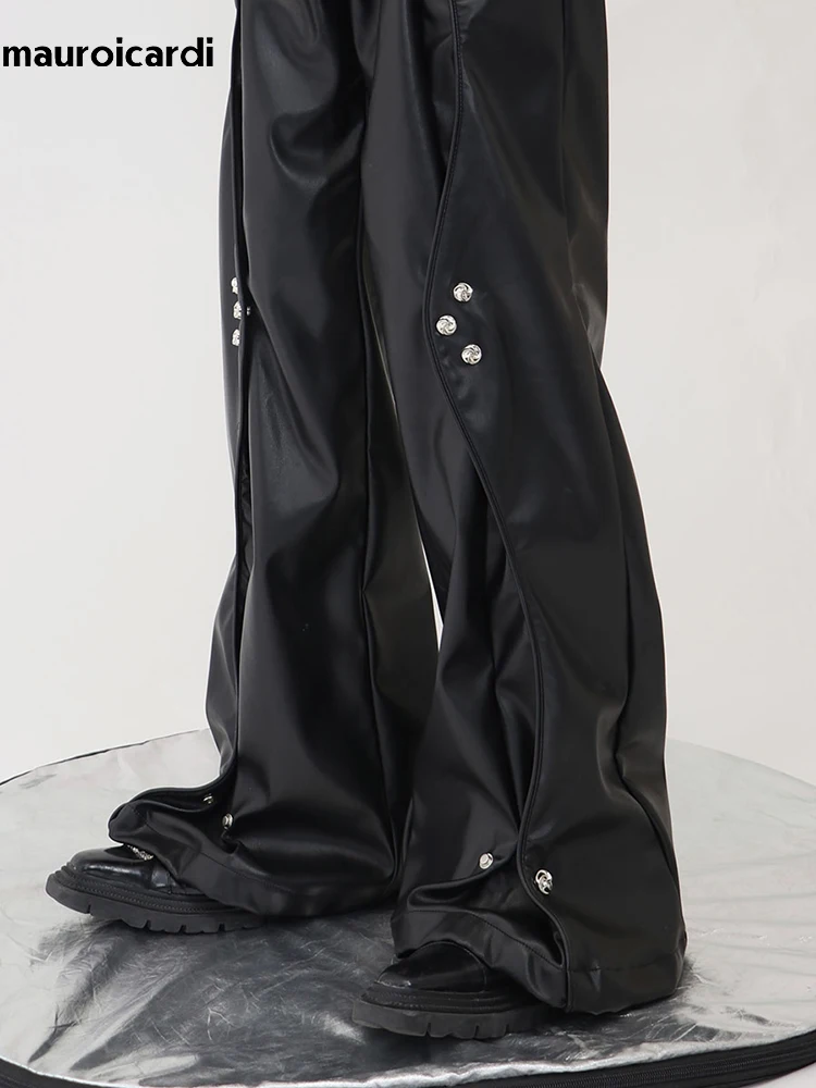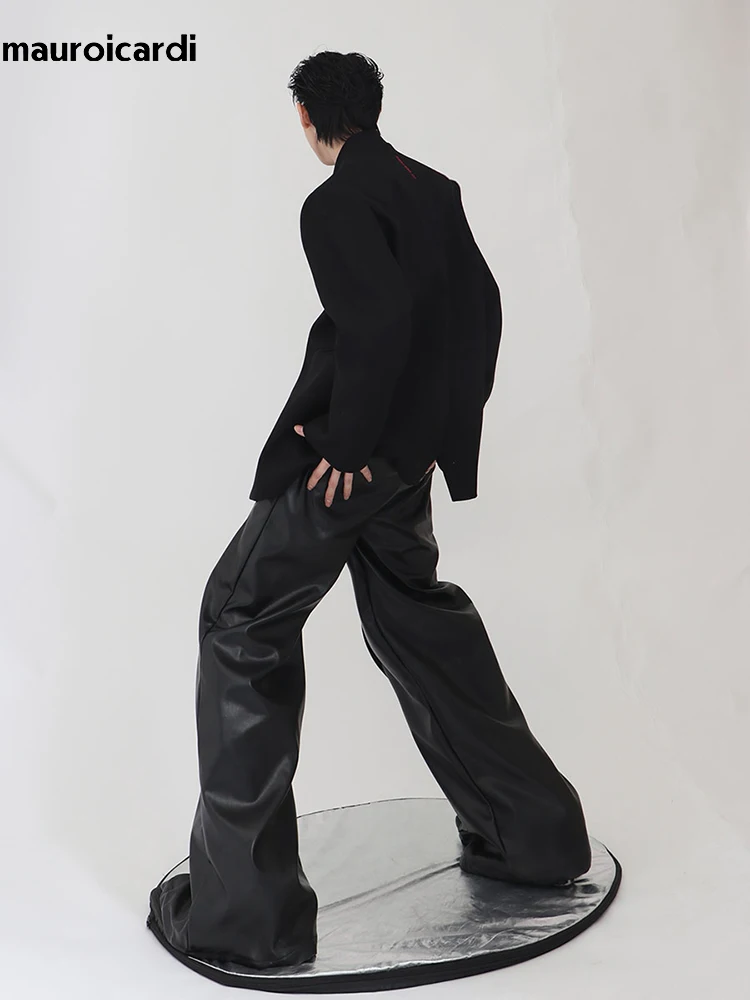 Mauroicardi אביב סתיו מגניב ארוך Loose מקרית רך שחור עור מפוצל מכנסיים גברים יוקרה מעצב בגדי מכנסיים אופנת 2023