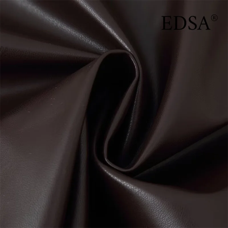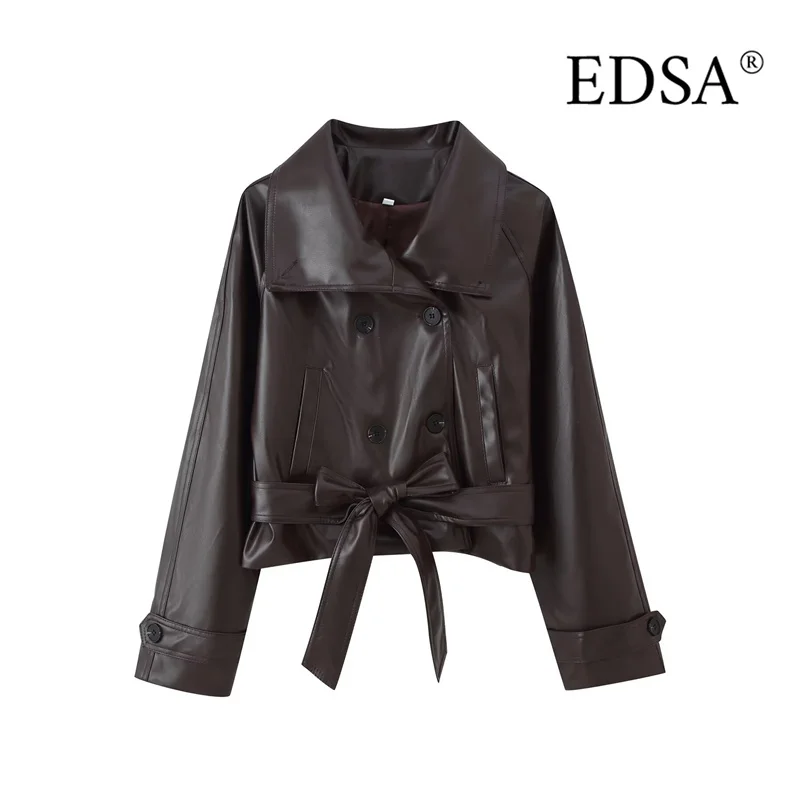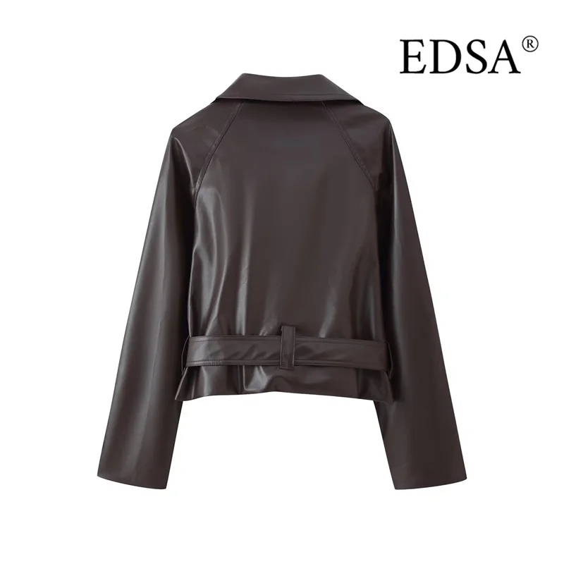 ג'קט קצר מעור PU לנשים EDSA עם חגורה, שרוולים ארוכים כפולים, מעיל נשי וינטאג'