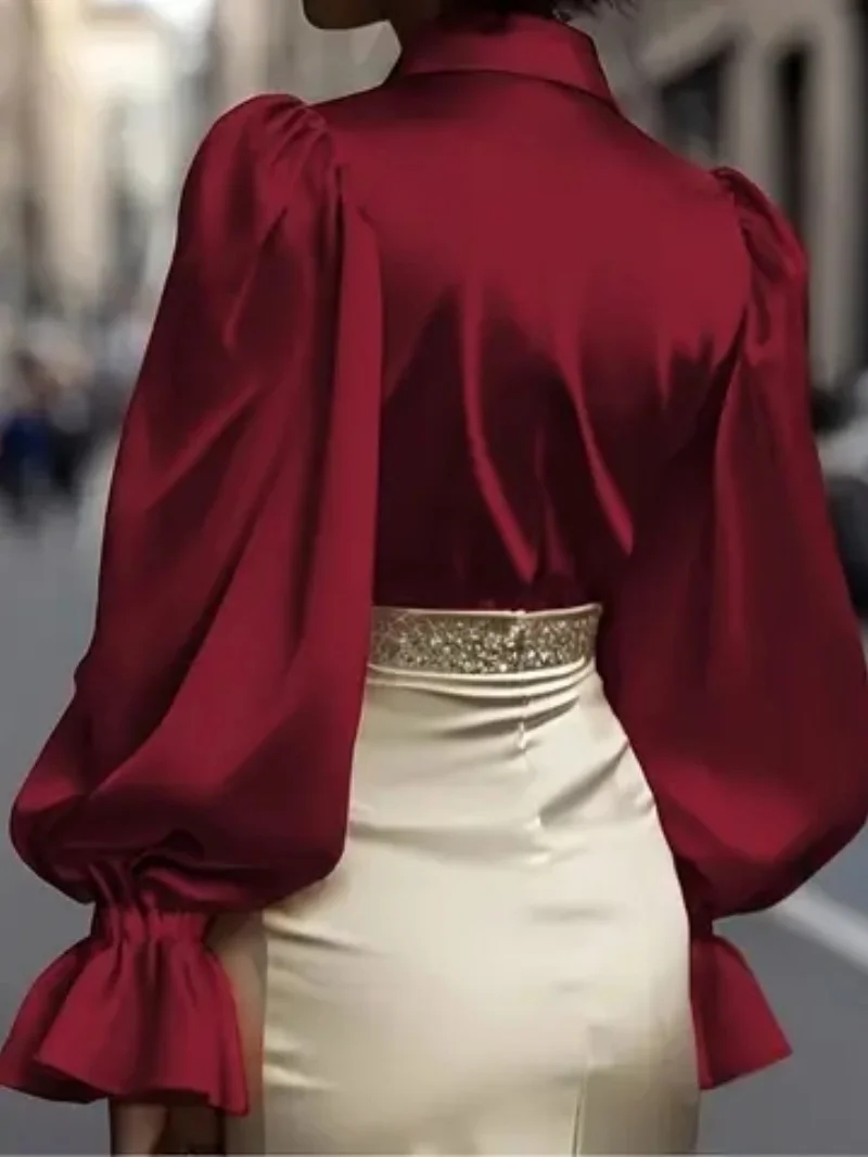 חולצת סאטן אלגנטית עם שרוולים מפונפנים וצווארון עם כפתורים - חולצה מודרנית ללבישה במשרד ובשימוש יומיומי