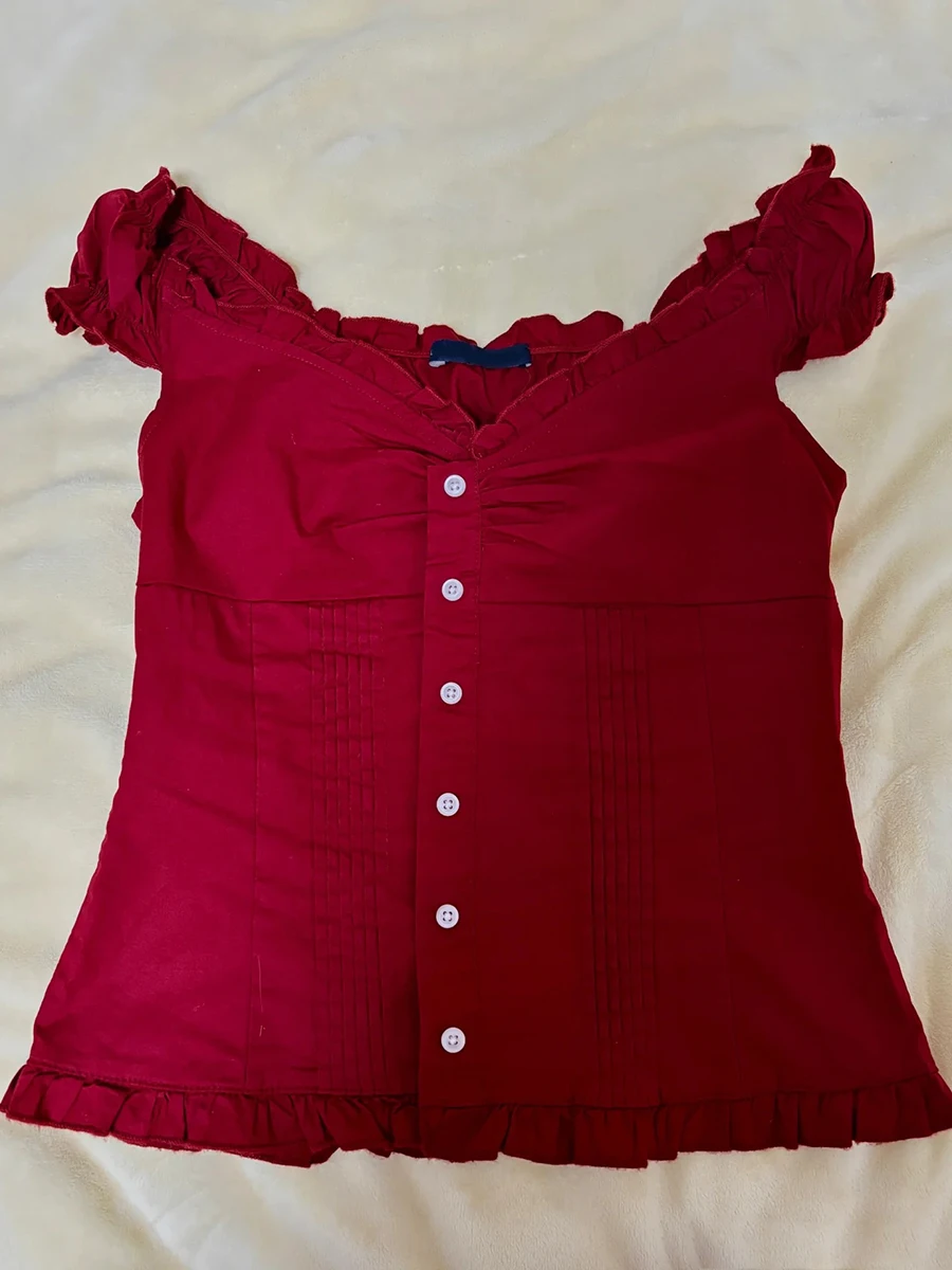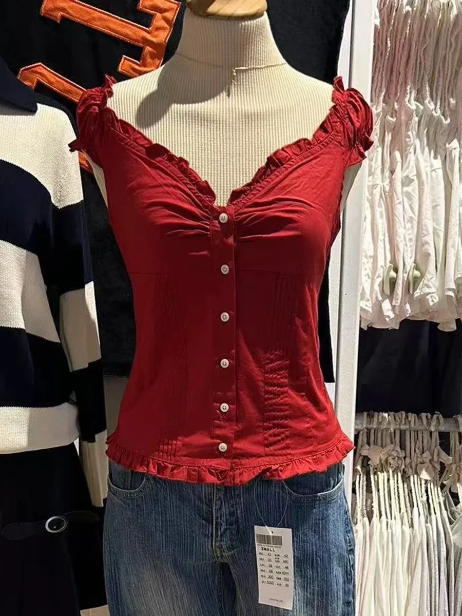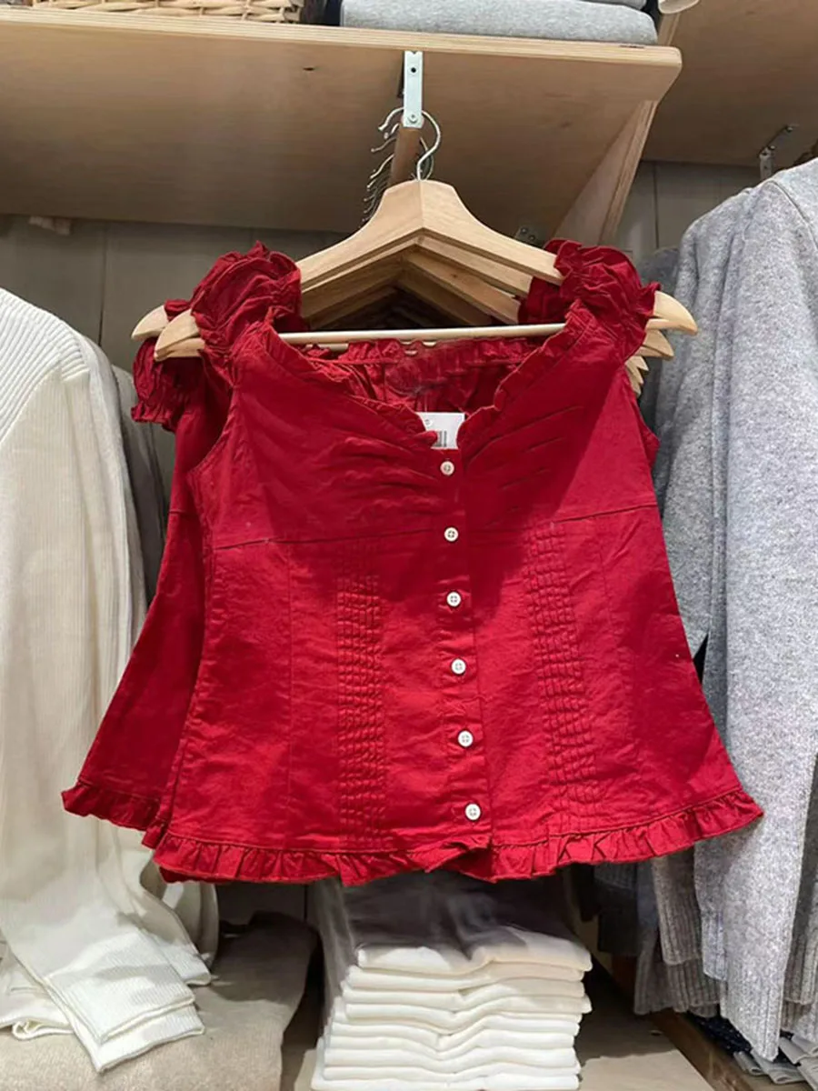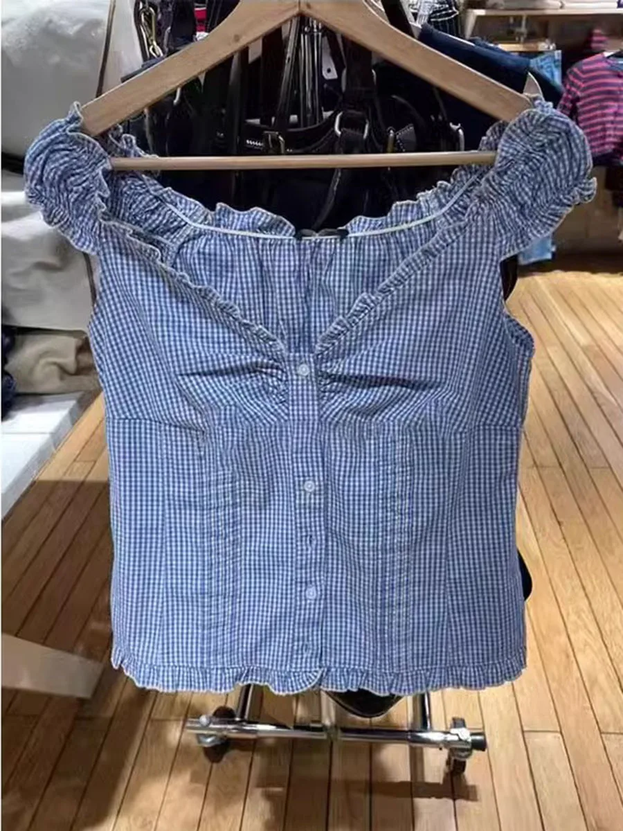 חולצת פטריות בצבע כחול עם צווארון V לנשים, שרוול פוף יחיד, קיפולים צרים, חולצות קיץ חדשות ומתוקות, חולצות קרופ קז'ואליות