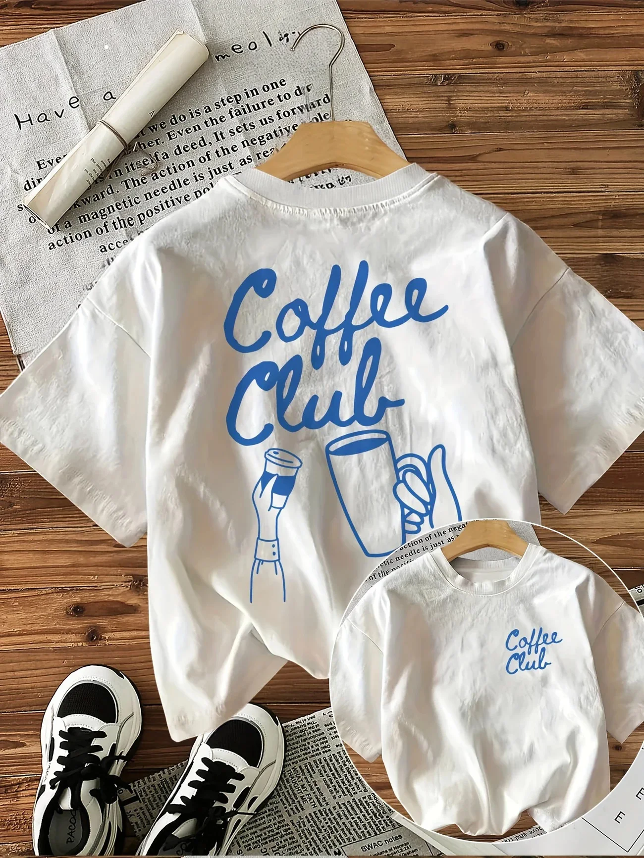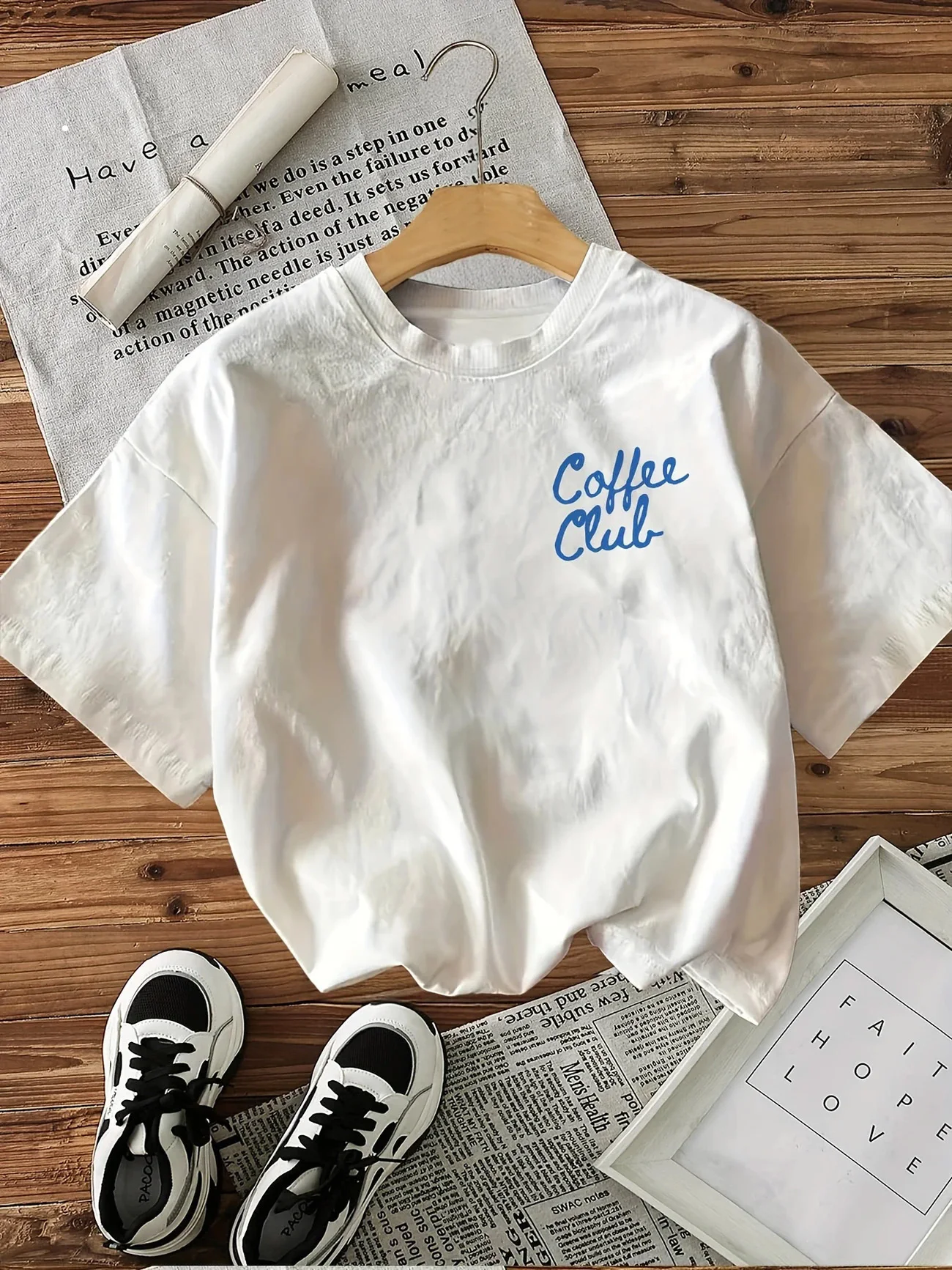 חולצת צוואר עגולה קז'ואל לנשים עם שרוול קצר, הדפס גרפי של מועדון קפה, עיצוב כוס קפה, בגדים רטרו לנשים