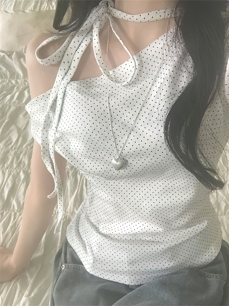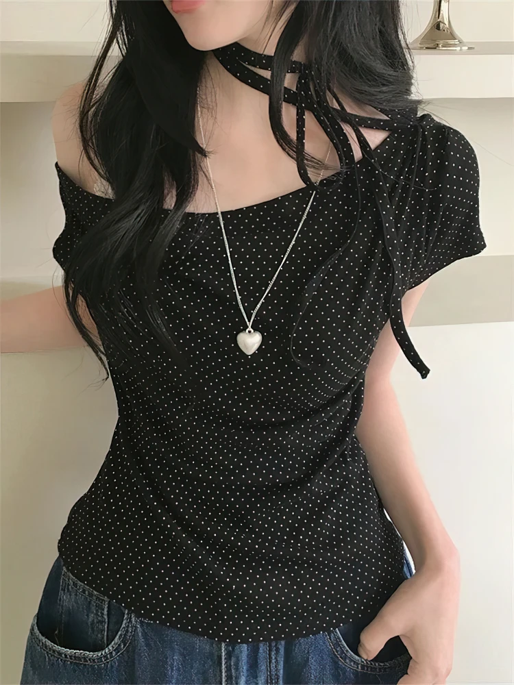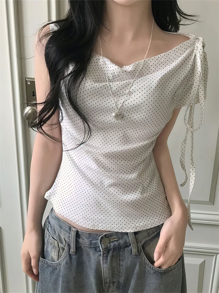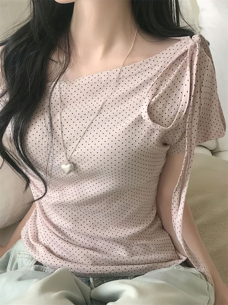 חולצת קיץ אלגנטית עם הדפס נקודות, קשירה בכתף, שרוולים קצרים, גזרה א-סימטרית, סגנון קוריאני, צמודה, חלקה וקז'ואל לנשים
