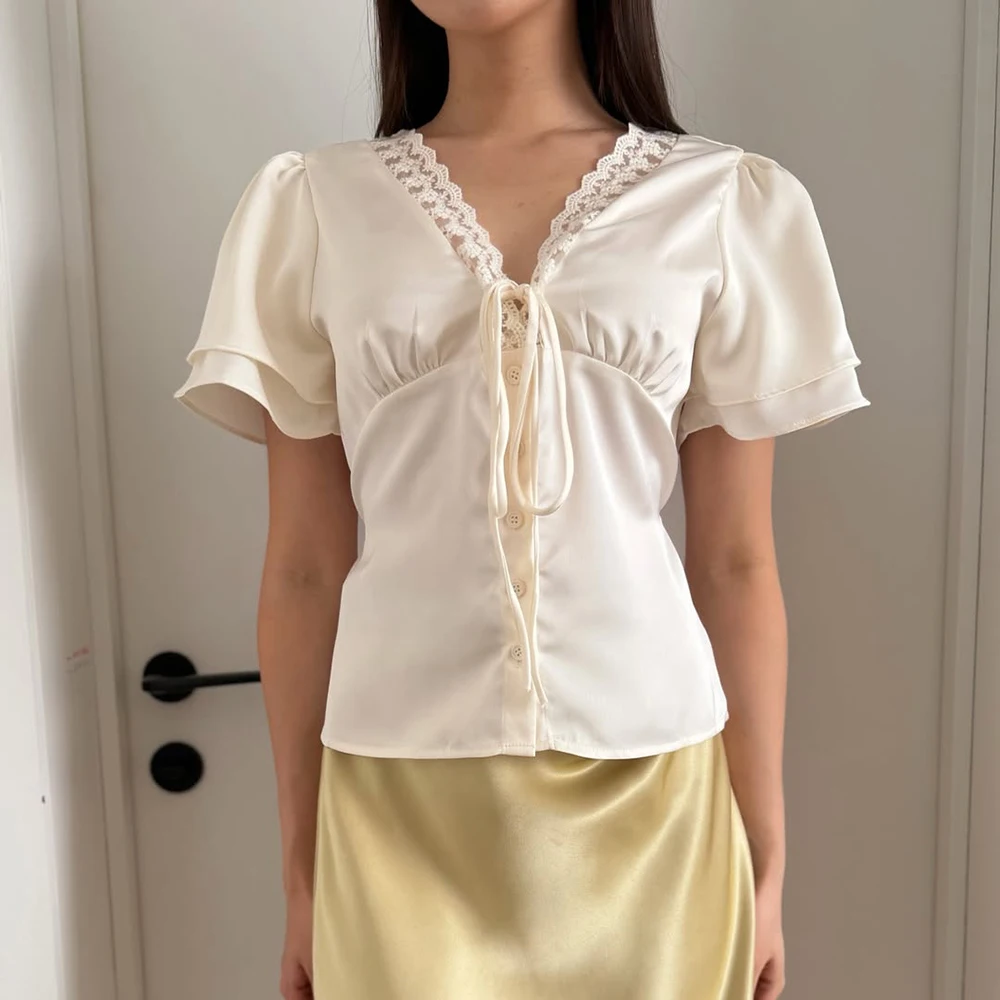 חולצת תחרה אלגנטית Tuularose לנשים, מחשוף V משגע, פסים משולבים בתחרה, חולצה קצרה לקיץ, אופנת יוקרה למסיבות, מראה עליון לנשים