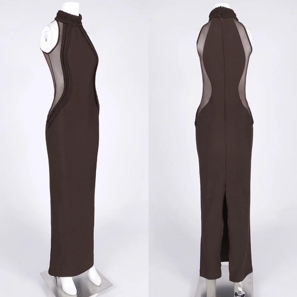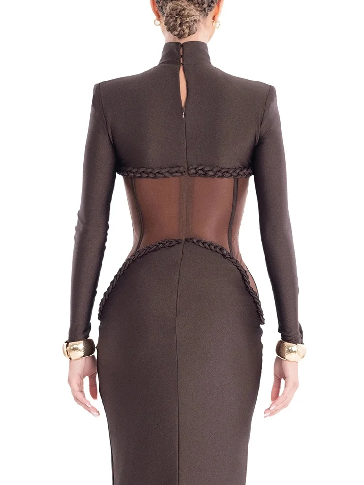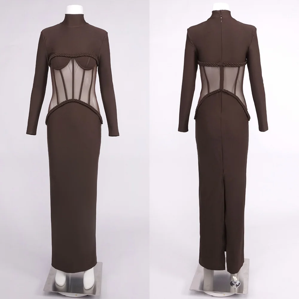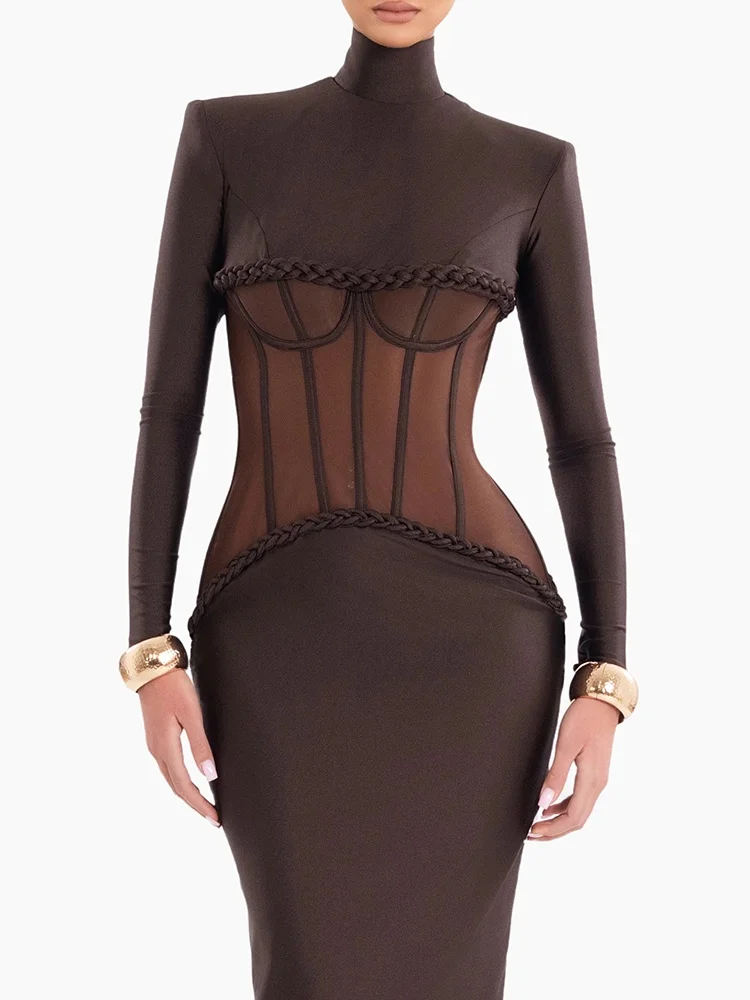 שמלות ארוכות מפוארות בצבע חום עם קורסט שקוף לנשים - שמלת מקסי עם שרוולים ארוכים, מחשוף גבוה ופרטי מותן רשת