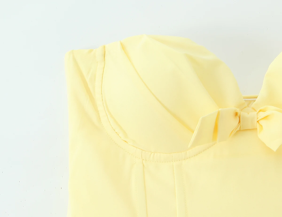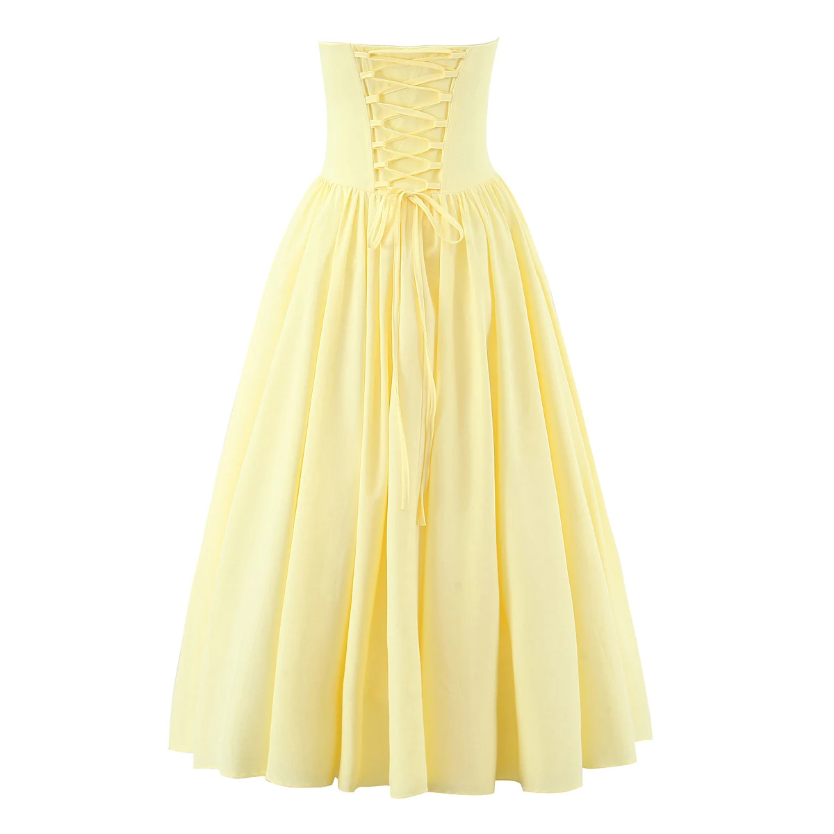 שמלת חגורה ארוכה ומחמיאה עם חגורת חזה משובצת בחוטים סקסיים בשלושה צבעים לנשים, עם קשירה צלבית מאחור ושוליים מושחזים, מתאימה למסיבות ואירועים, צהובה