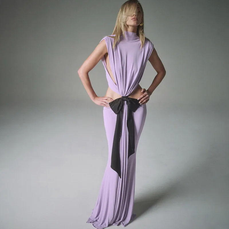 שמלת מקסי סקסית ואלגנטית עם גב חשוף, קשירת קשת, ללא שרוולים, חורים מובלטים, שמלות ארוכות למסיבות ערב לבנות סגולות