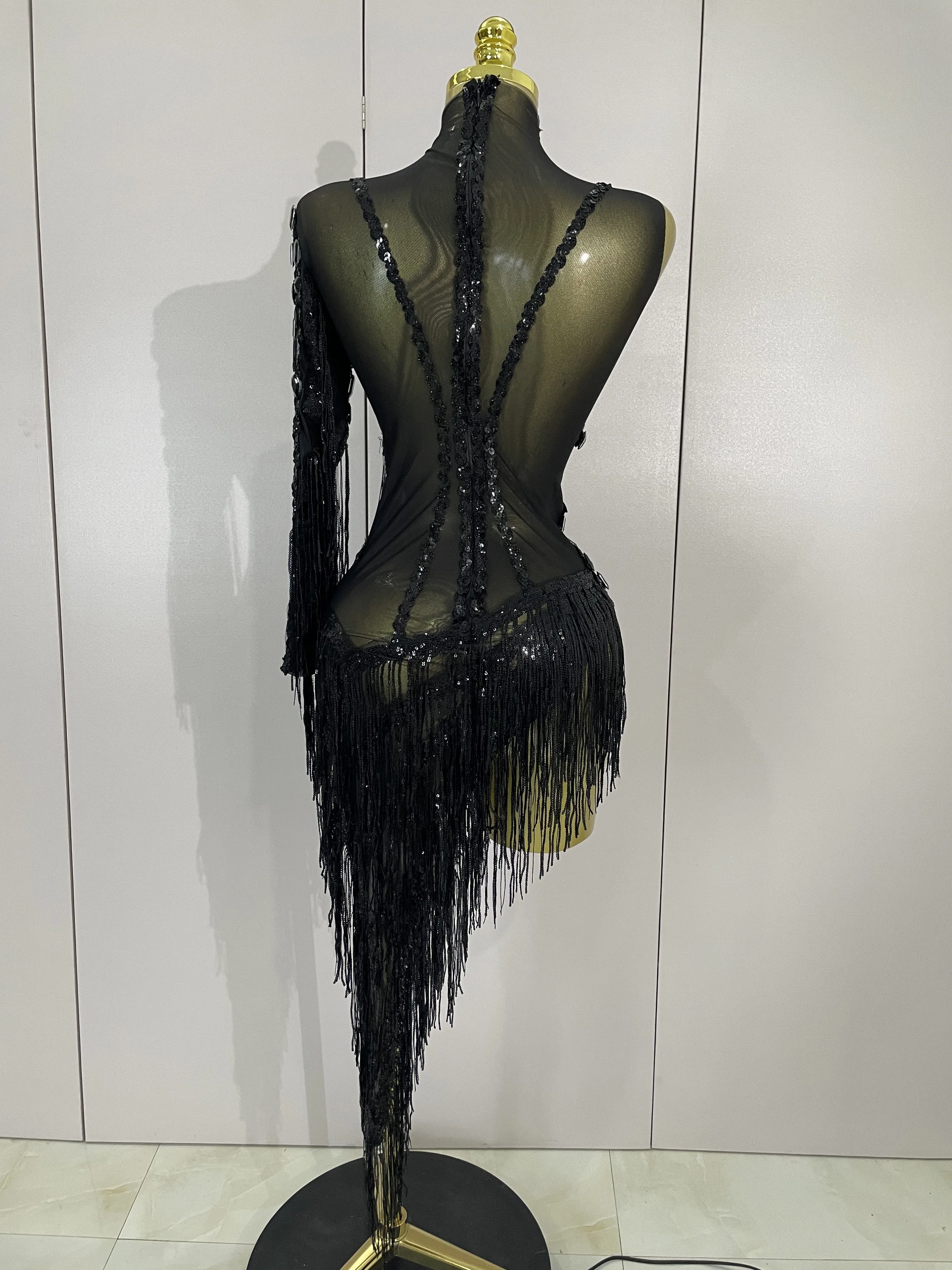 שמלת ריקוד לטיני עם כתף אחת, מבריקה עם חרוזי זירקוניה ותליון, לנשים, למועדון לילה ולבמה