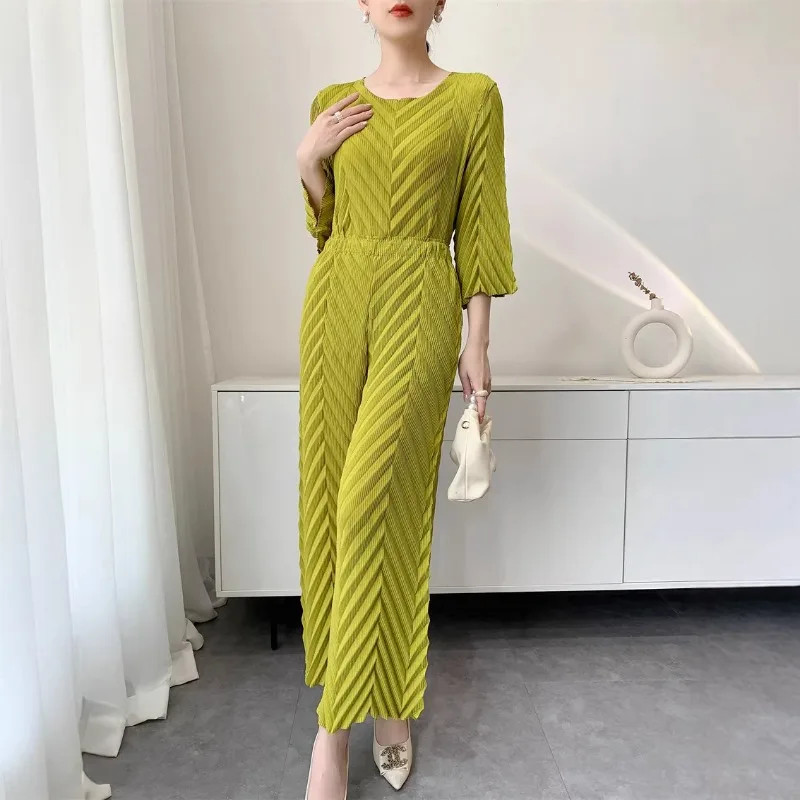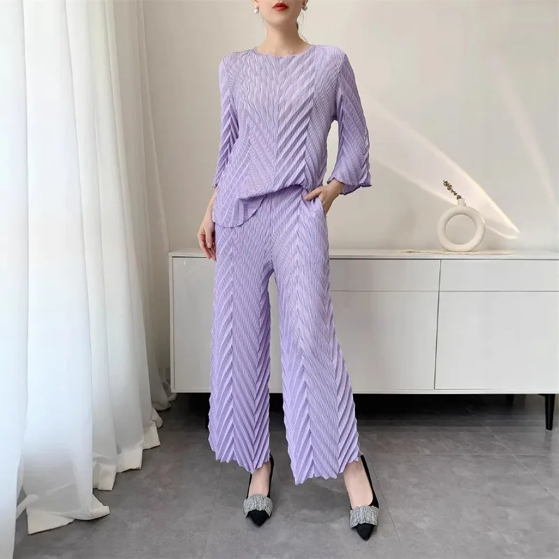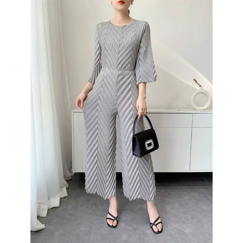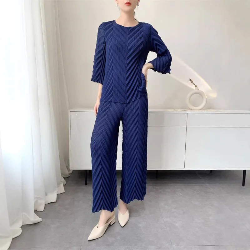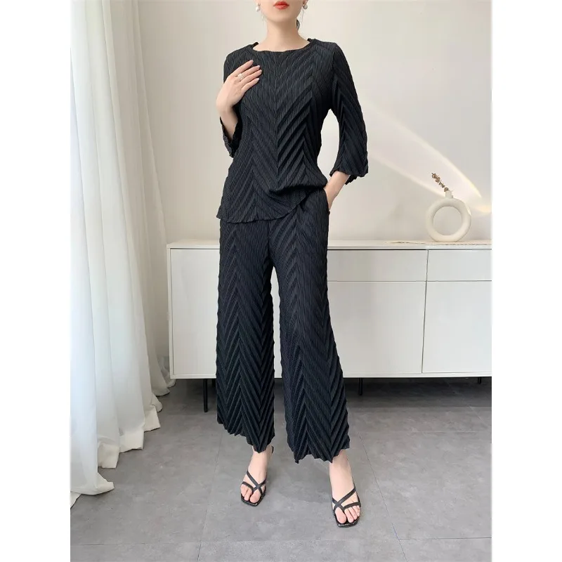סט מכנסיים קפלים בעבודת יד לנשים, אביב 2026, חולצת טי נוחה וקלילה עם שרוולים שבעה, מכנסיים רחבים ומשוחררים, סט 2 חלקים