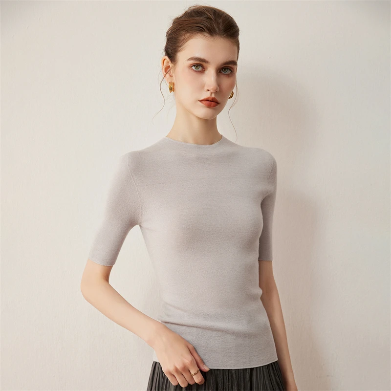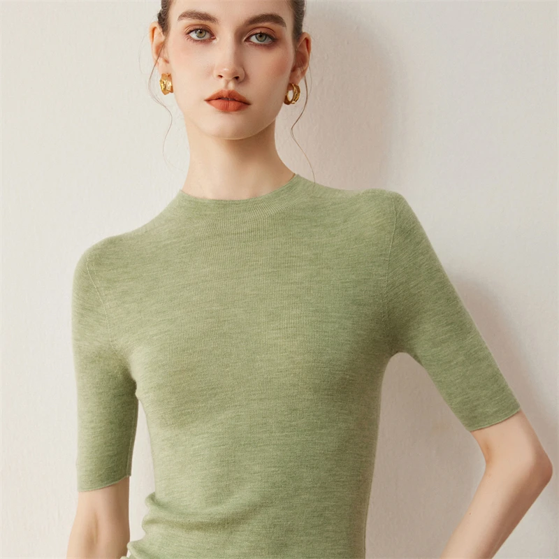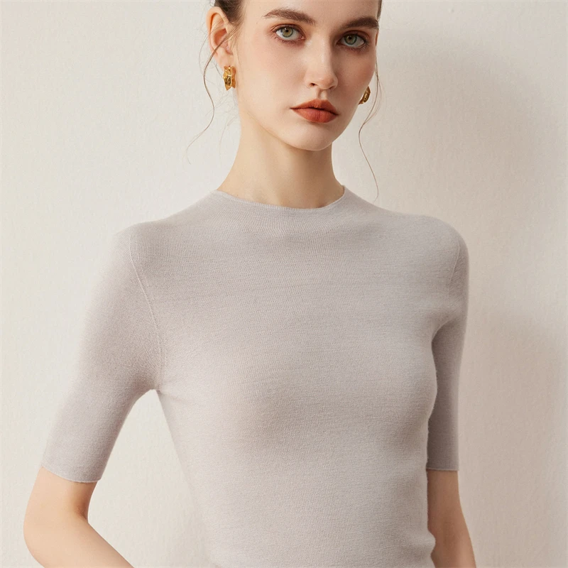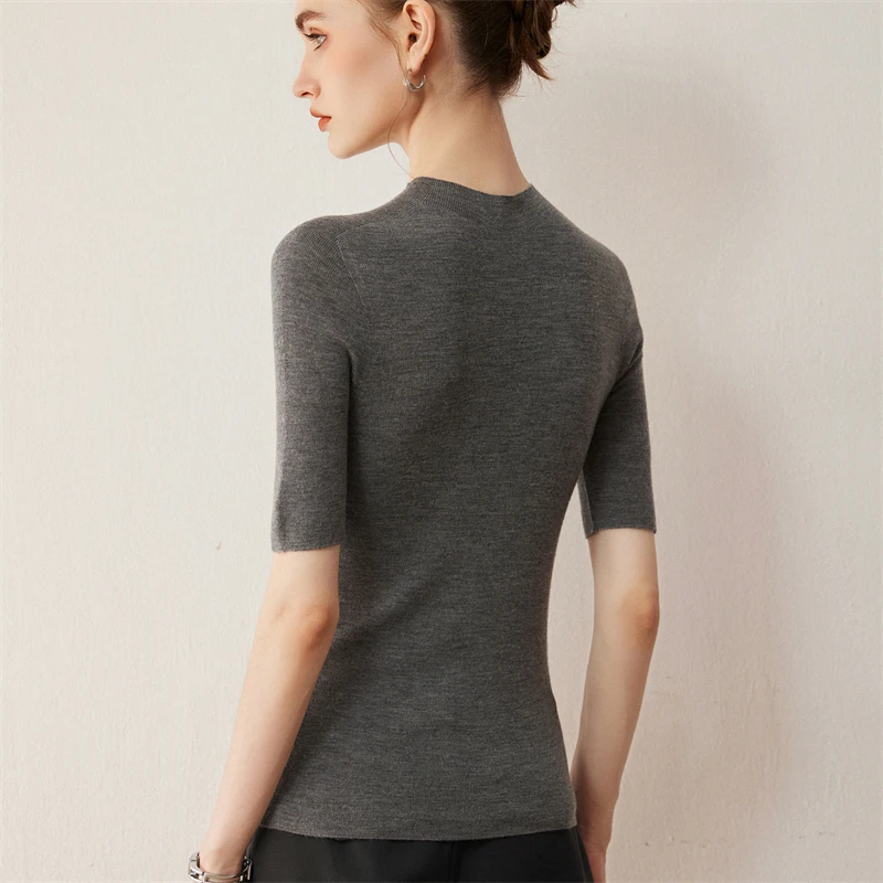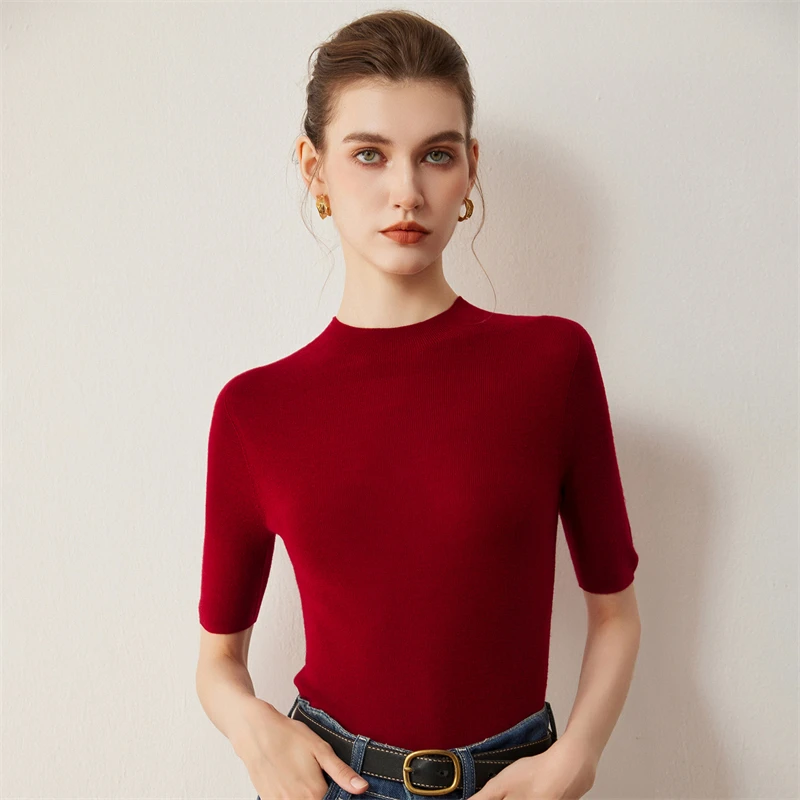 סוודר סולידי צרפתי מינימליסטי מבד צמר 100% לנשים לסתיו עם שרוול קצר וצווארון חצי גבוה, מתאים לגוף צר