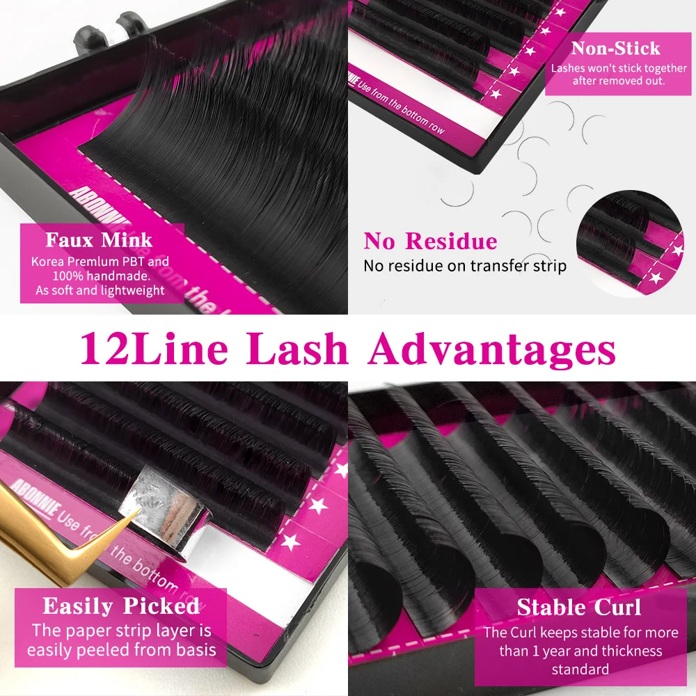 Abonnie B/C/D 12 שורות הארכת ריסים משי רך בצבע שחור מאט לאיפור יופי
