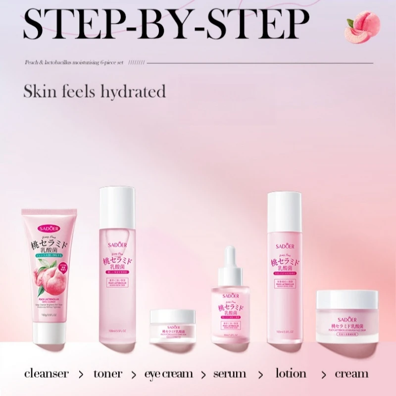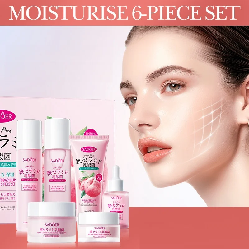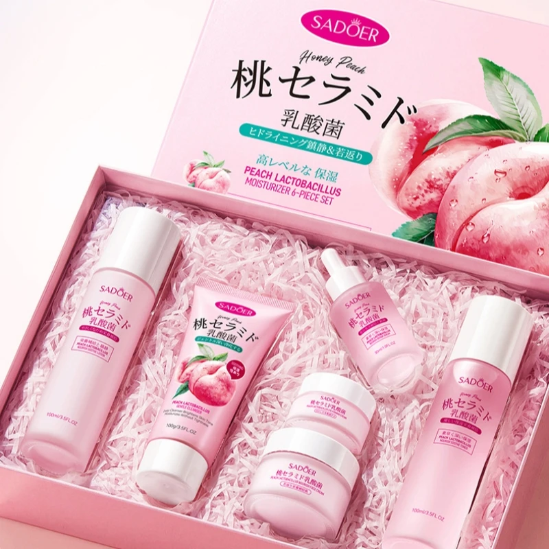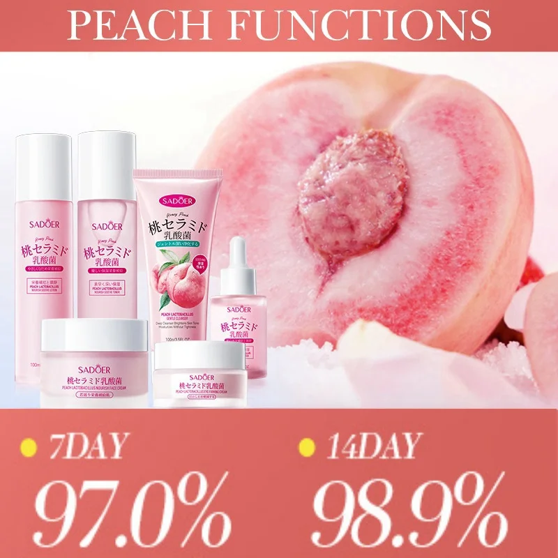 ערכת טיפוח לעור אפרסק בת שישה חלקים, מארז מתנה לטיפוח פנים, מכיל סרמיד, סודיום היאלורונאט, תמצית פריחת דובדבן וכו'. כולל סבון פנים, טונר, סרום, קרם פנים, קרם עיניים, מסכת לילה, בסך הכל 7 מוצרים, לחות, הזנה, טיפוח ניקוי הפנים, מתאים לכל סוגי העור, ללא אלכוהול, מתנה נהדרת לחברים במהלך החגים