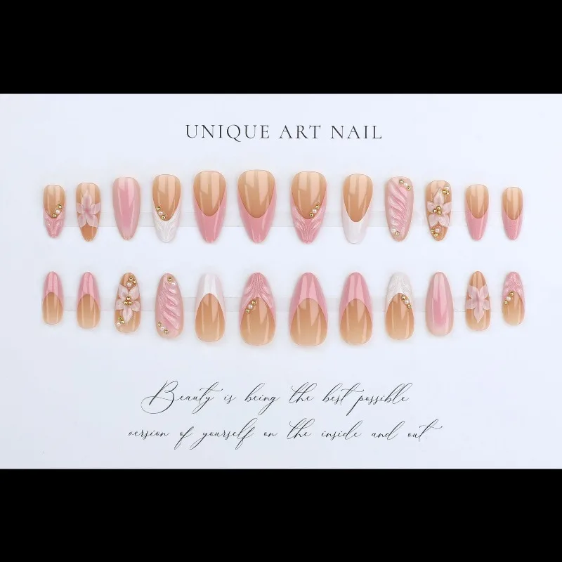 24 יחידות קישוטי פרחים ורודים צרפתיים בצורת 3D לציפורניים מזויפות, ציפורניים מלאכותיות אקריליות חוזרות לשימוש, ציפורניים מזויפות עצמיות
