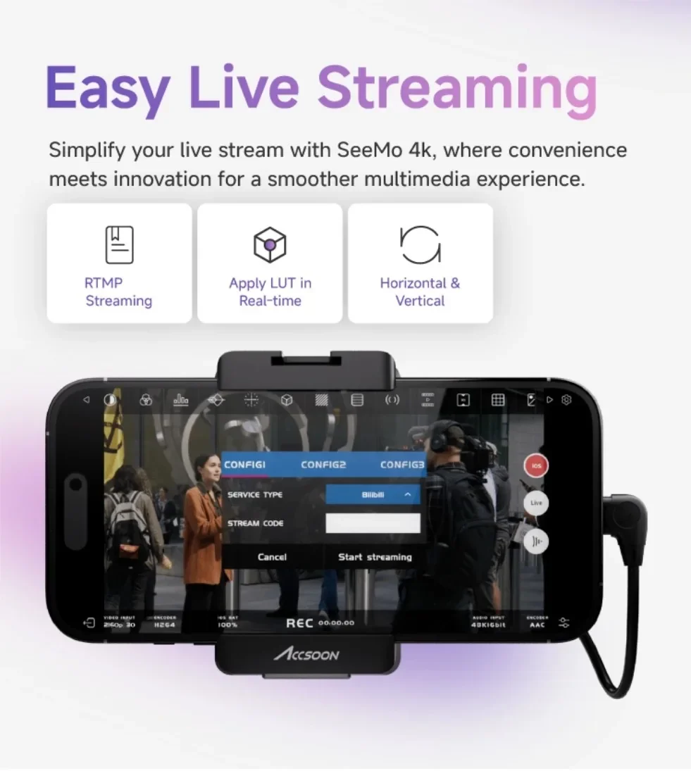 מצלמת Accsoon SeeMo HDMI ל-4K USB-C ניטור וידאו לאייפון אייפד RTMP שידור חי בזמן אמת יוטיוב טוויץ'