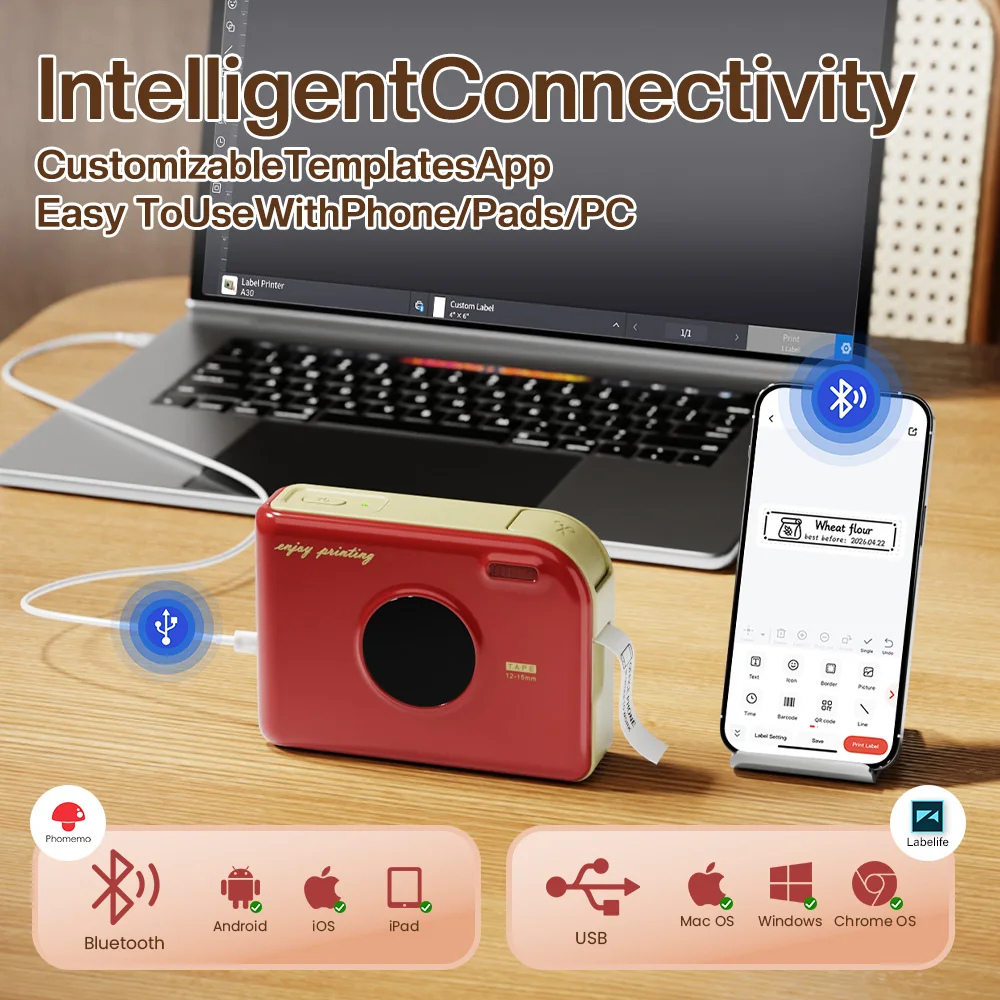 מדפסת תוויות Phomemo A30 מדפסת סרט מיני מדפסת אלחוטית בלוטות' מדפסת ניידת אידיאלית לתגיות מתנה ותוויות תמונה