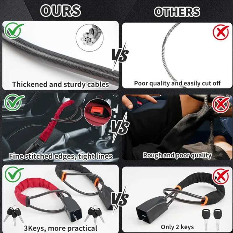 נעילת גלגל ההגה האוניברסלית לרכב עם אבזם לחגורת המושב ו-3 מפתחות למניעת גניבה לרכבים, חבל אבטחה עמיד