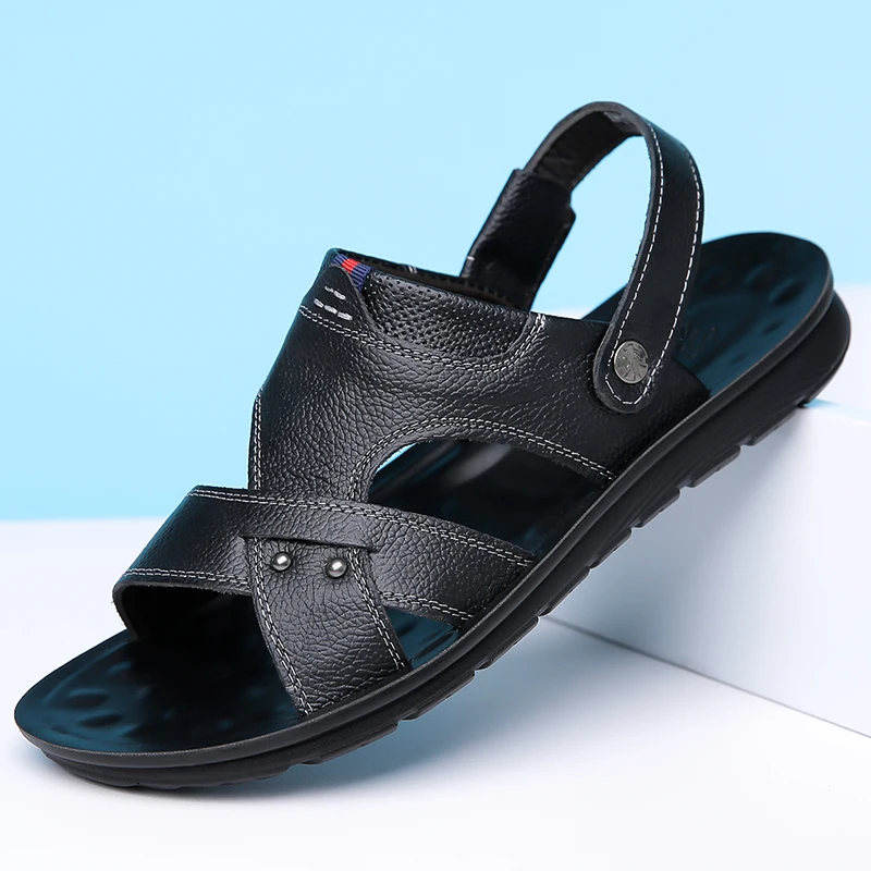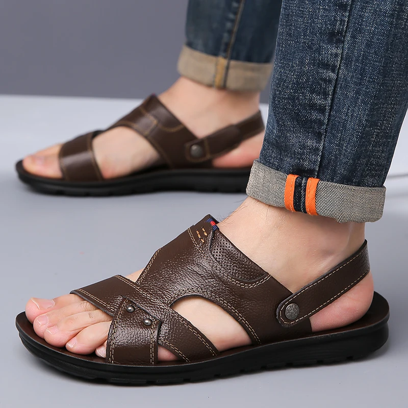 סנדלי קיץ לגברים מעור, נוחים, נגד החלקה, סוליה רכה, דו-שימושיים, נעלי חוף להנעלה קלה, כפכפי עור בקר-1884