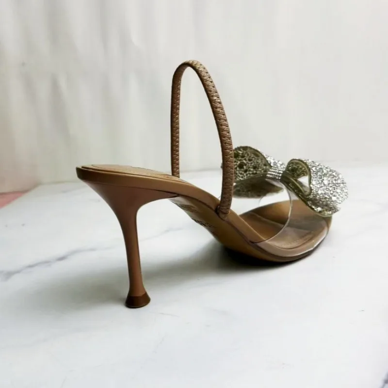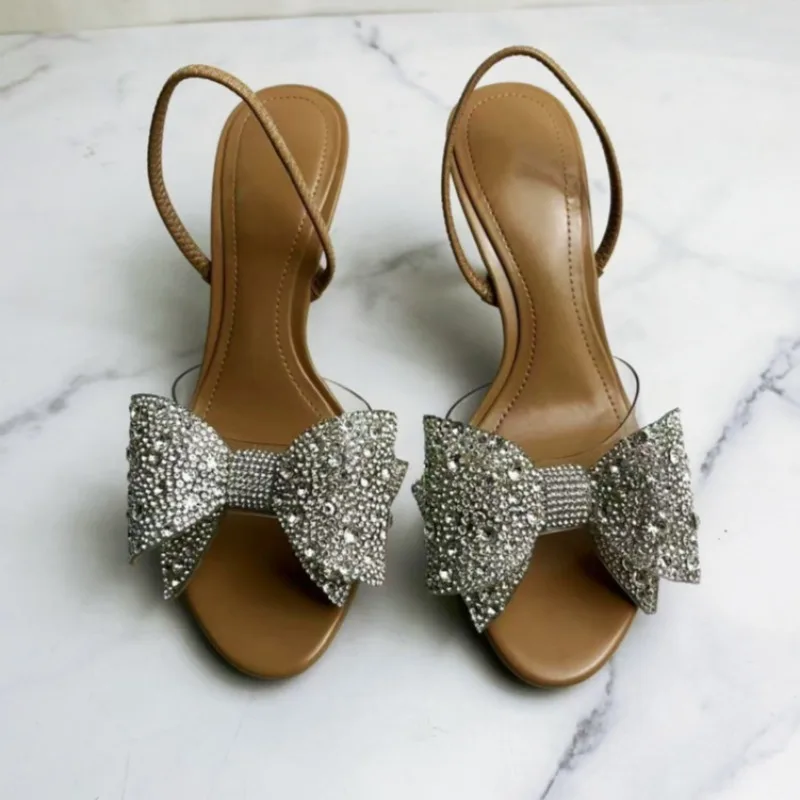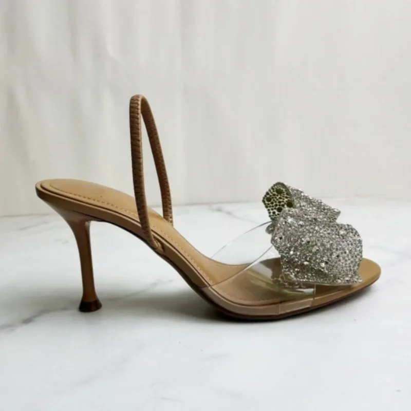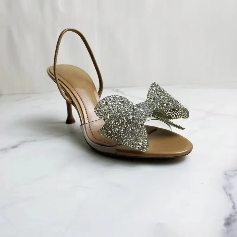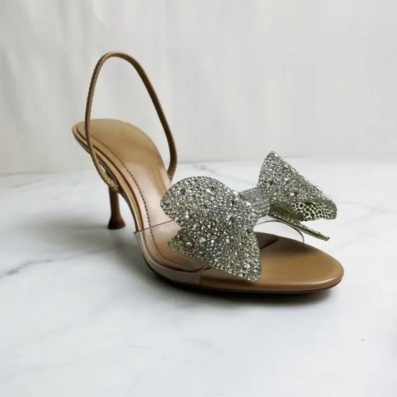 נעלי סנדלים מפוארות לקיץ 2025 עם קישוט קשת יהלומים, פתח קדמי שקוף, מתאימות לאירועים, חתונות ואירועים ערב