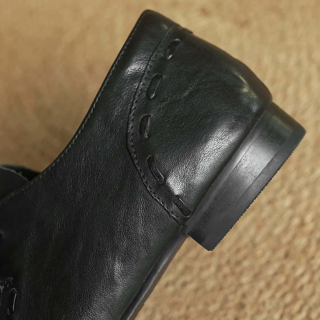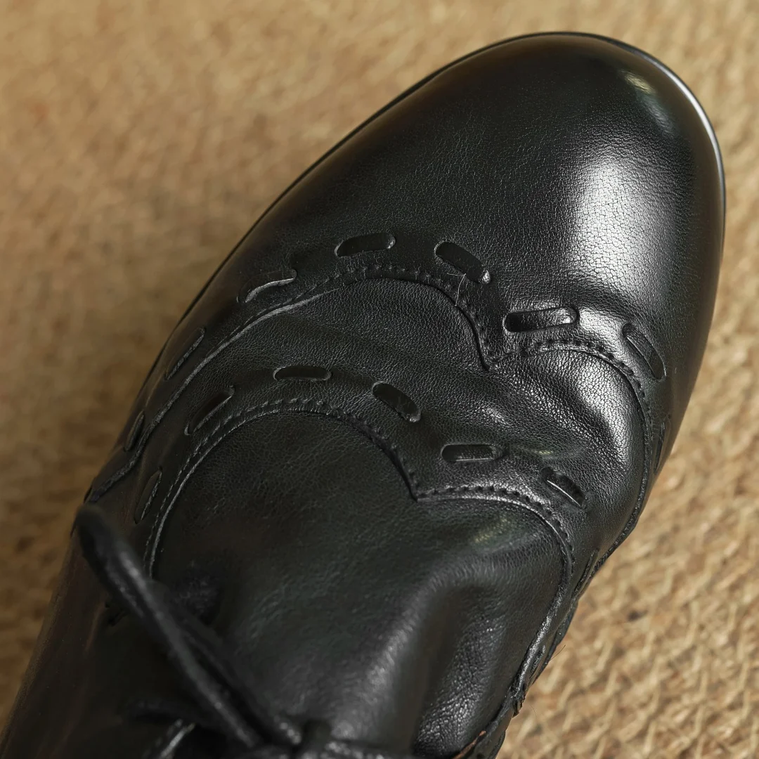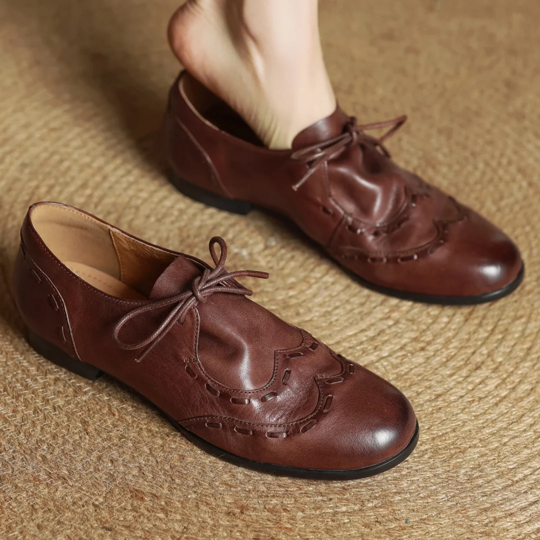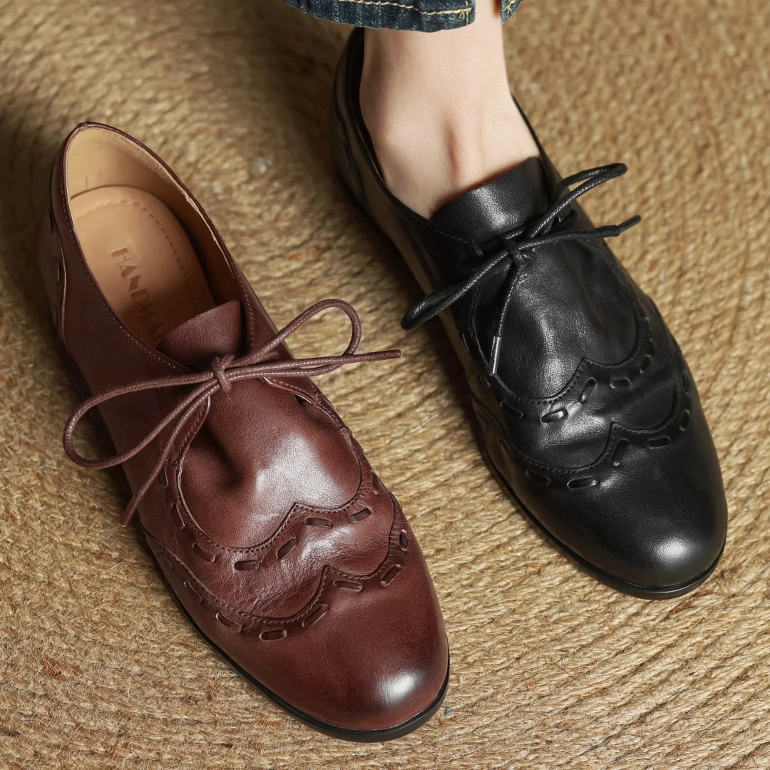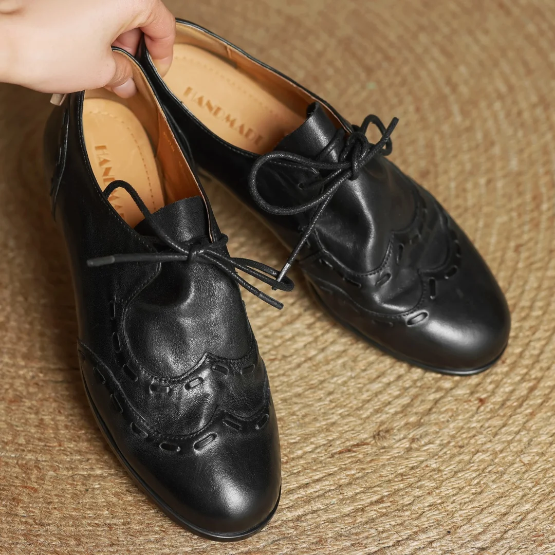 נעלי עור פרה לנשים עם קשירה, אוקספורדים, קדמה עגולה, חריטה בסגנון בריטי, נעלי רטרו לנשים במידות 33-40 2025