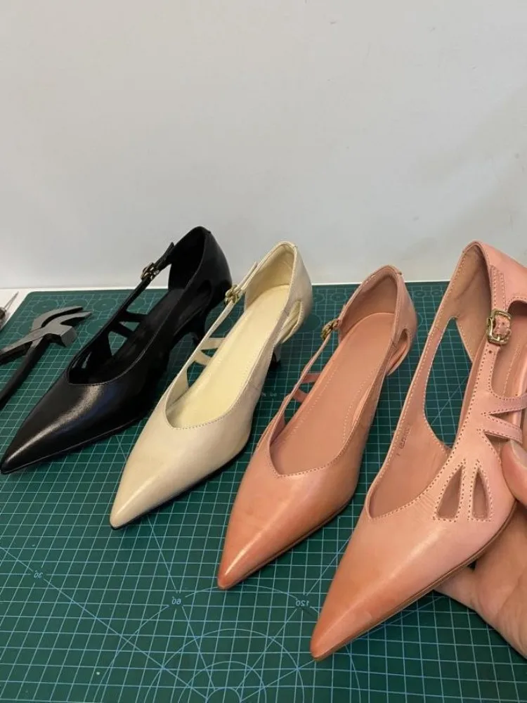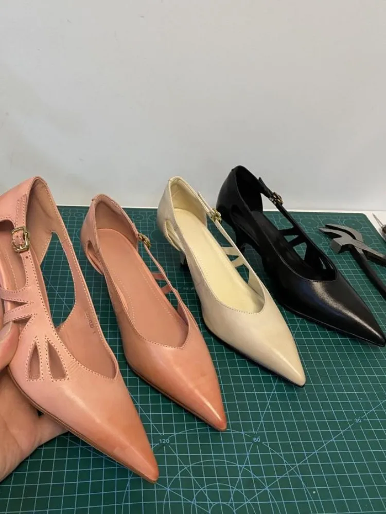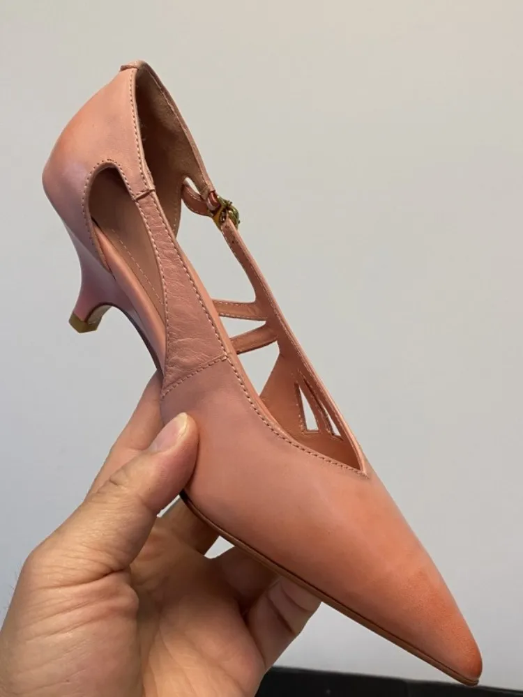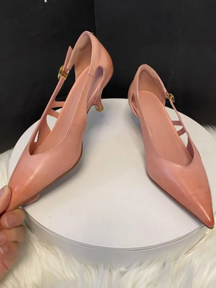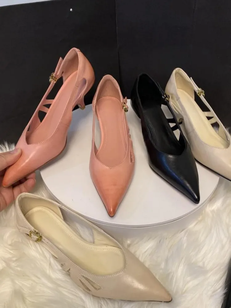 סנדלי עקב סטילטו מעור אמיתי לנשים בסגנון חיצוני לקיץ עם רצועת אבזם מחודדת בצבע אחיד