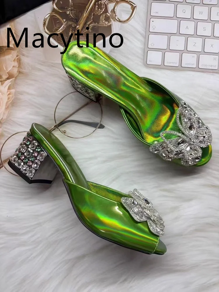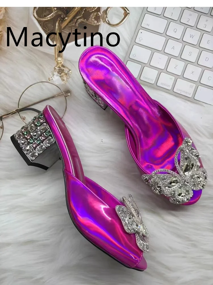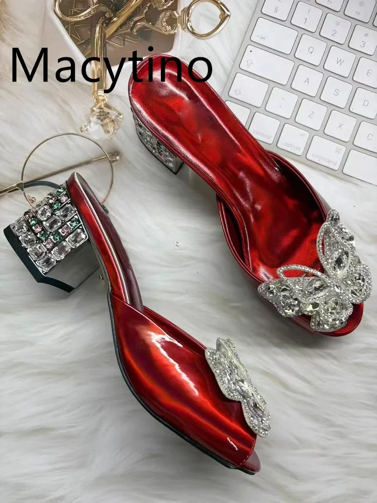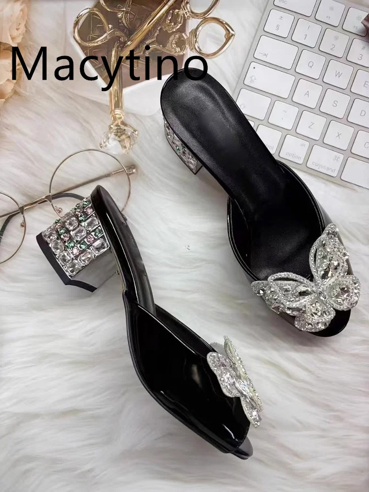 סנדלי עקב עבים עם פרפר יהלומים לנשים, פתח קדמי, נעליים עם עקב עבה, קריסטלים מבריקים, קיץ חדש, שמלת חוץ מולס