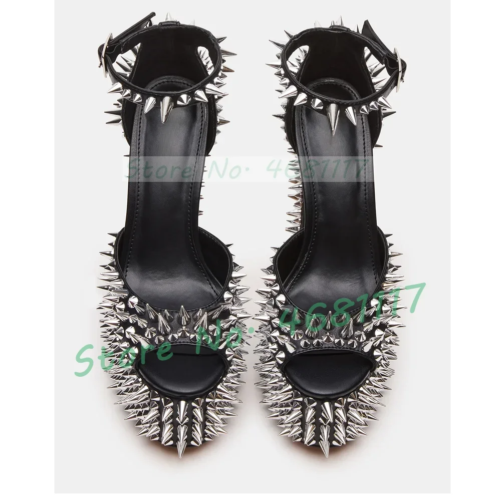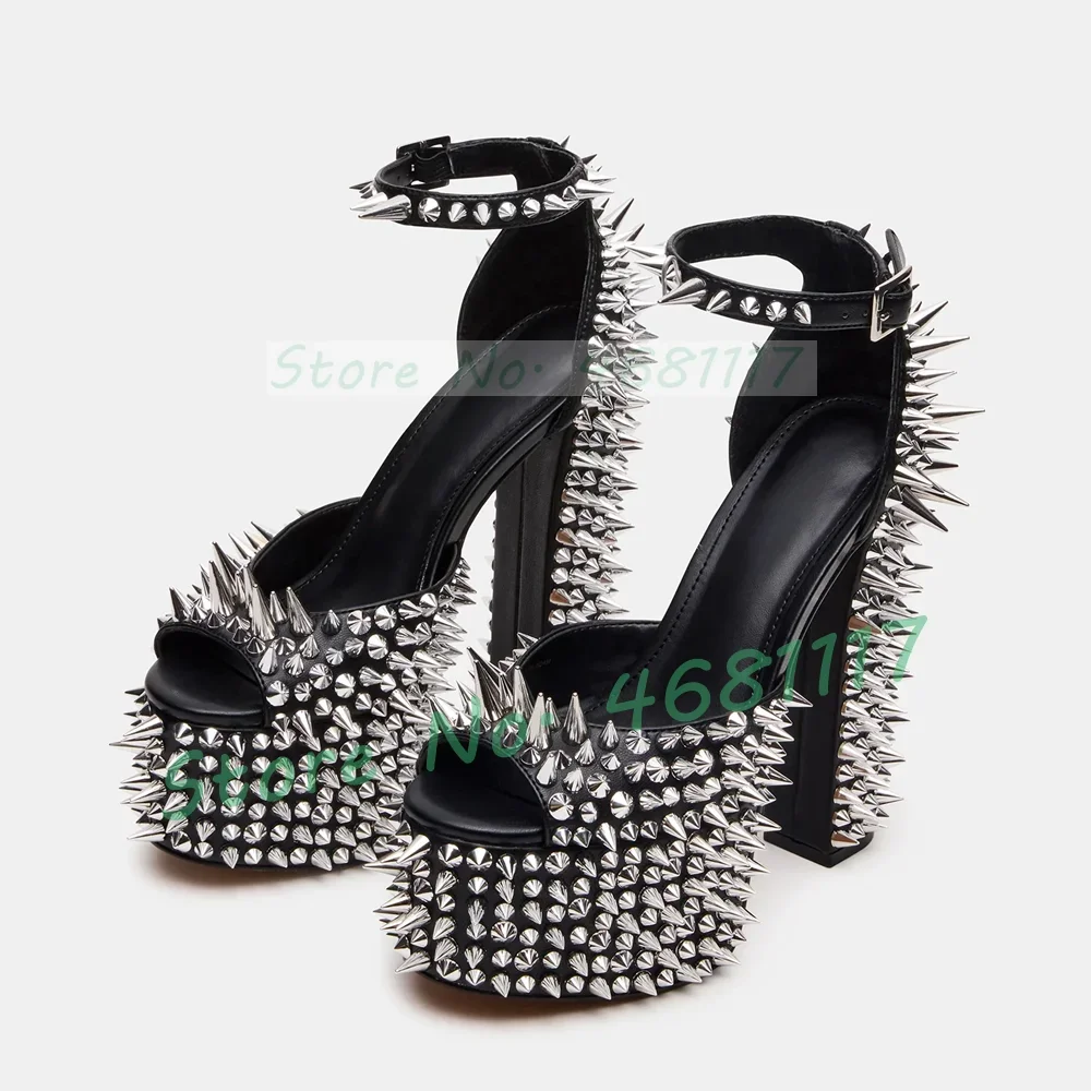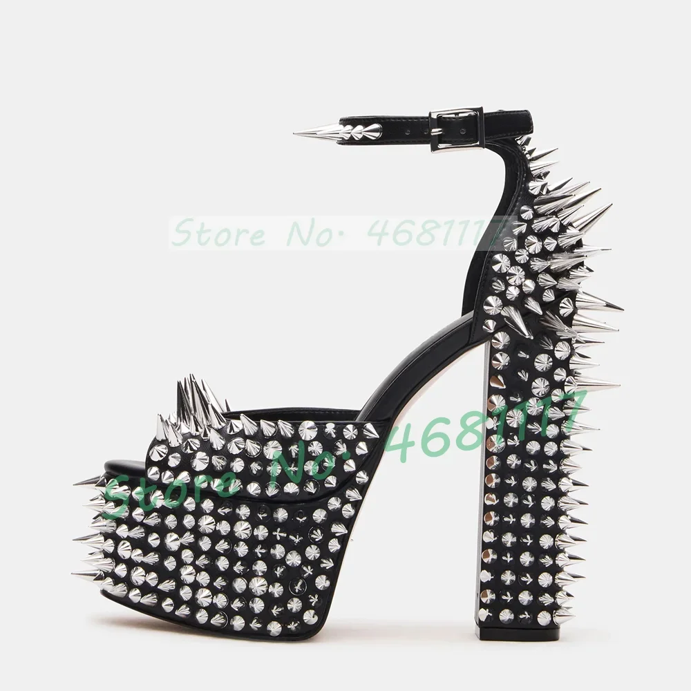 סנדלי פלטפורמה שחורות עם תפרים כסף לנשים, קישוטי ריווטים משגעים, נעלי מוטו בלוק עם עקב, נעלי חגיגה לנשים עם רצועת קרסול מבריקה