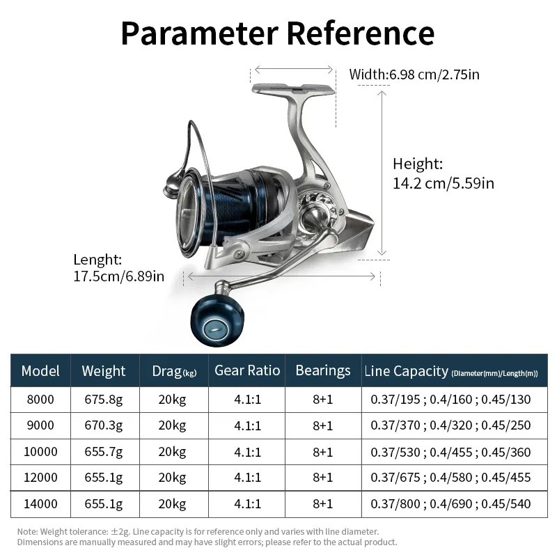 גלגולת ספינינג CHILENT LONGCAST 8000-14000 8+1 עם סגירה כפולה BB במשקל מרבי של 20 קילוגרם, עם גוף מתכתי, מתאימה לדיג ולשימוש יומיומי
