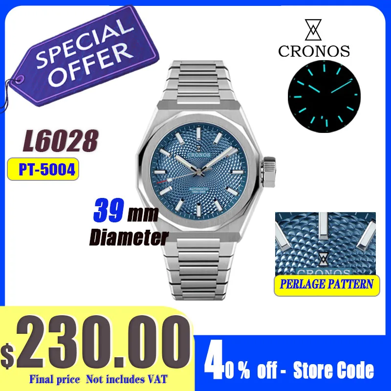 שעוני יד אוטומטיים לגברים Cronos New Rhombus Perlage 39mm Dial PT5004 Miyota 90S5 See-through Caseback 10ATM Lumious