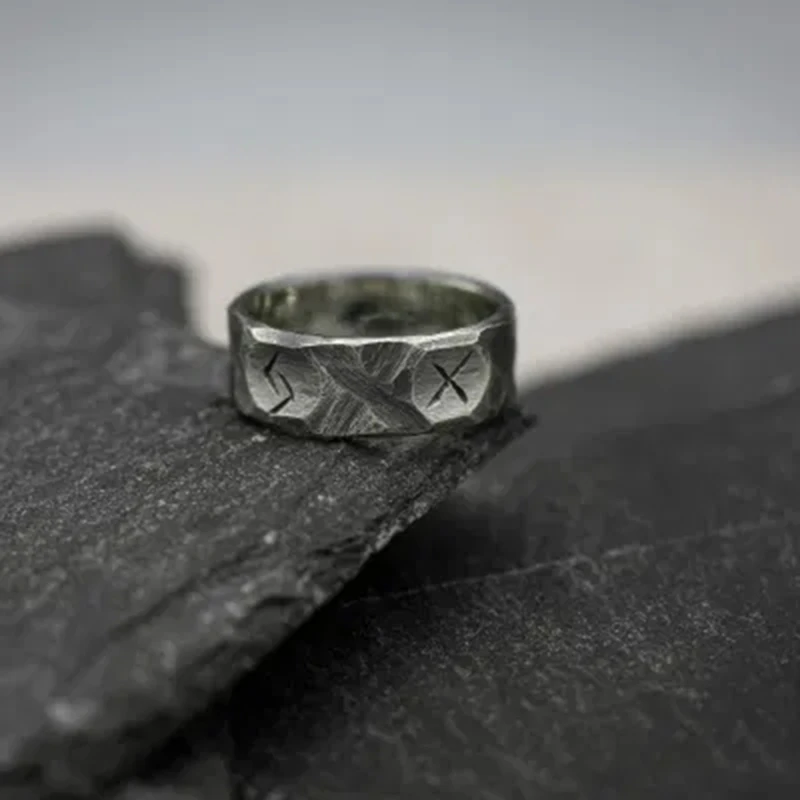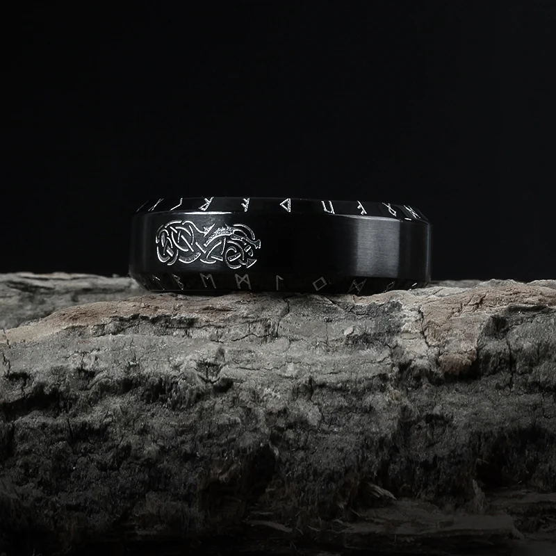 הטבעת מעוצבת בדגמים נורדיים של אודין ותכשיטי מילים, כפי שצוין בכותרת.