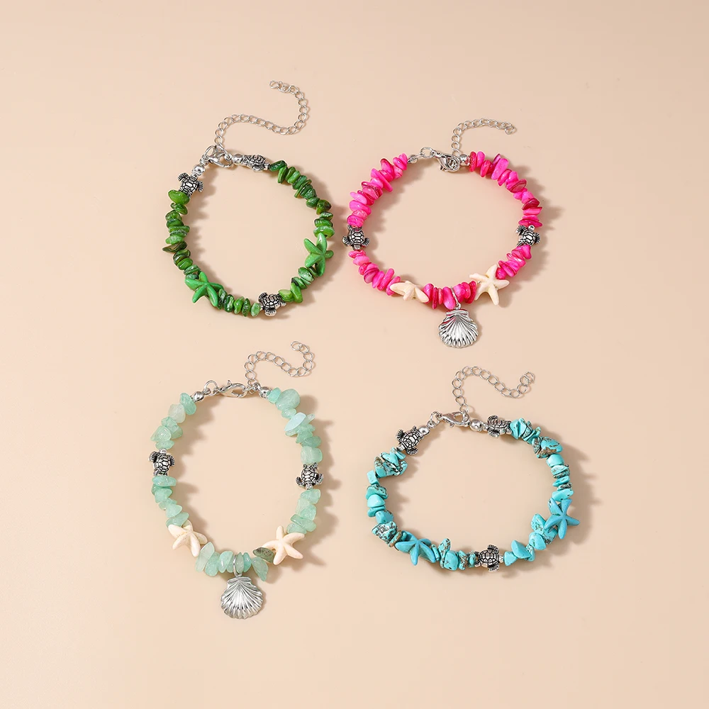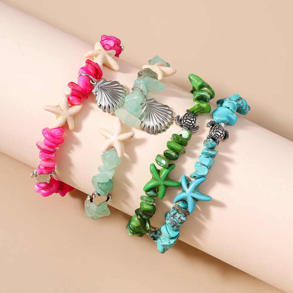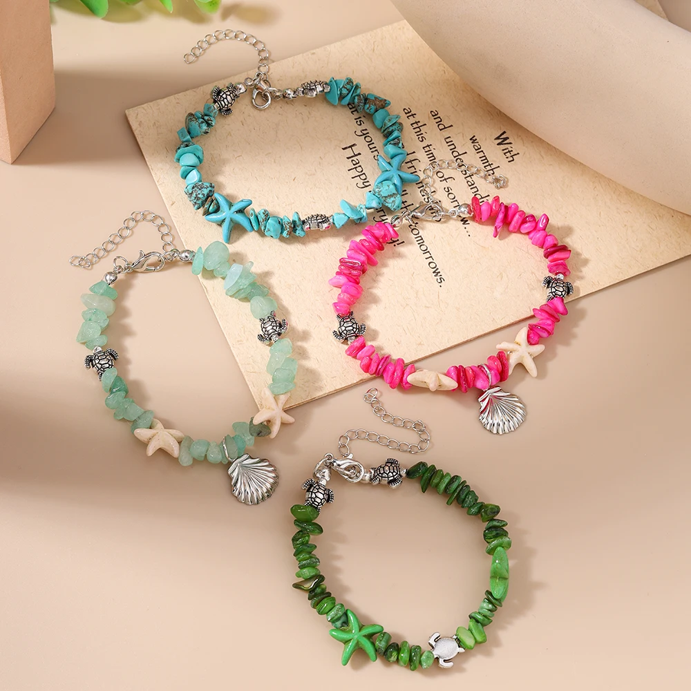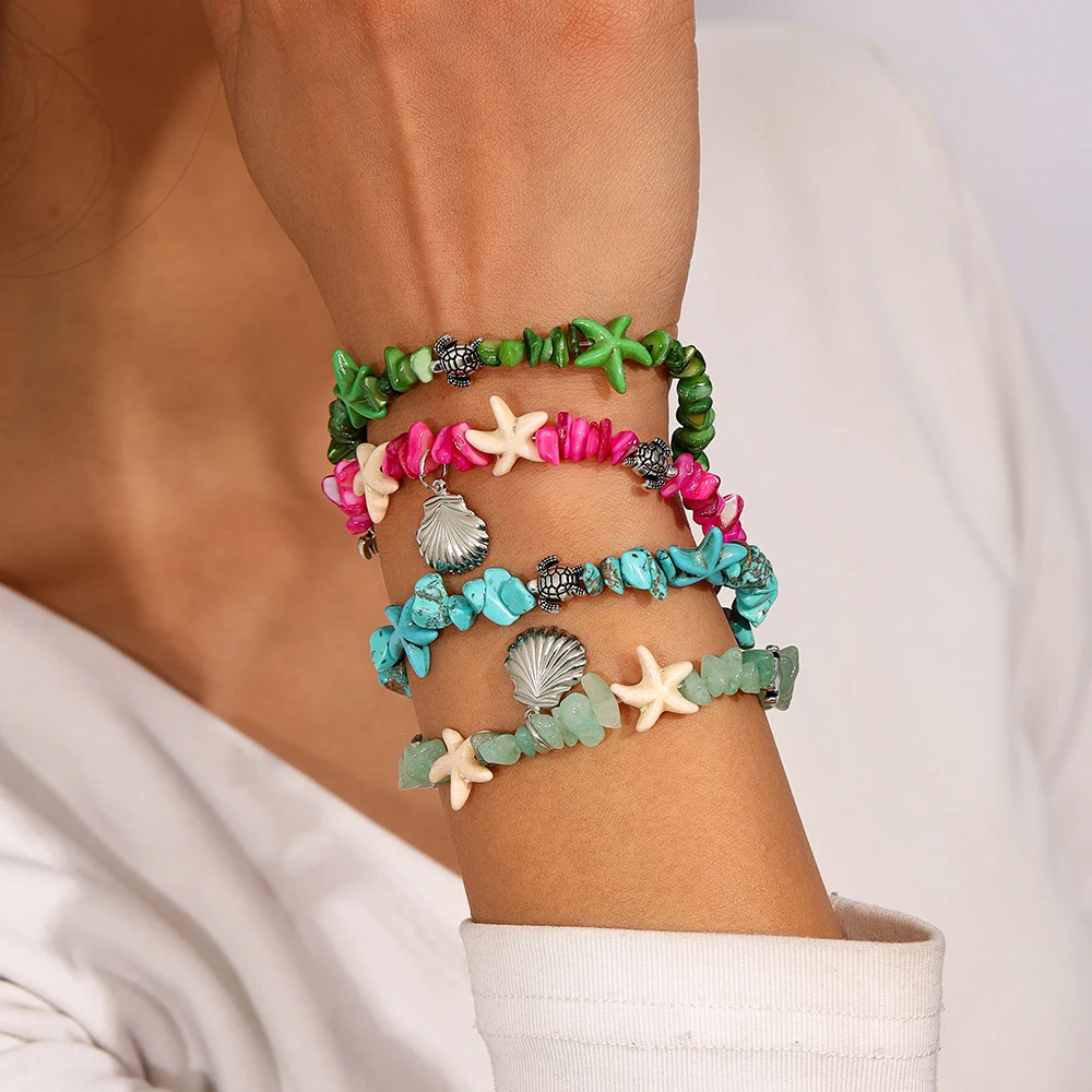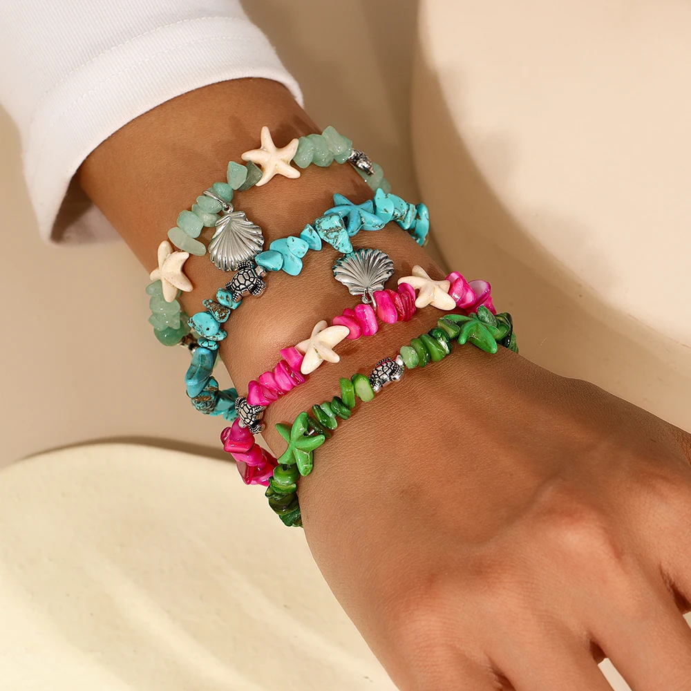צמיד בוהמי עם צדפות וכוכב ים לנשים, צב ים עם אבנים בלתי סדירות, צמיד ידני לידידות בחוף הים ותכשיטים לחופשה