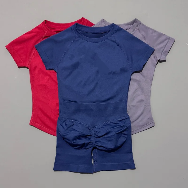 2 חתיכות סט ספורט היסטלו לנשים חולצה קצרה ללא תפרים מכנסי אימון ספורטיביים חליפת מכנסי אימון חליפות כושר לחדר כושר