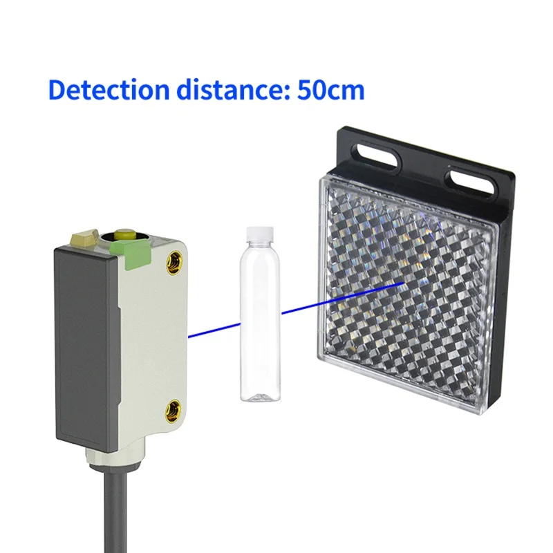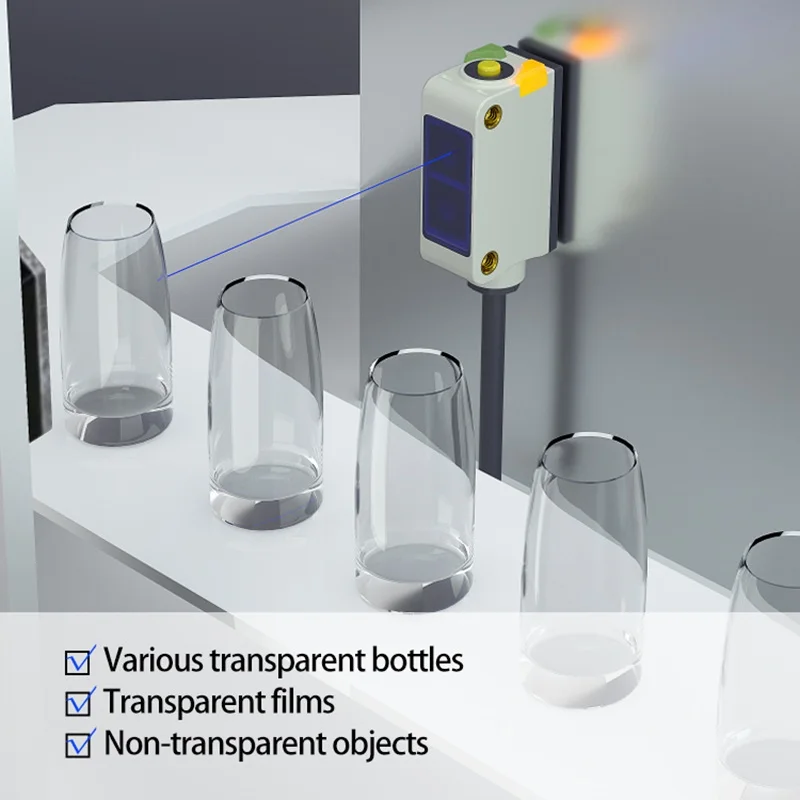 Rilevamento stabile di vari oggetti trasparenti e non trasparenti, interruttore fotoelettrico per il rilevamento di bottiglie trasparenti, alta precisione e sensibilità di rilevamento, prestazioni stabili di protezione multipla.