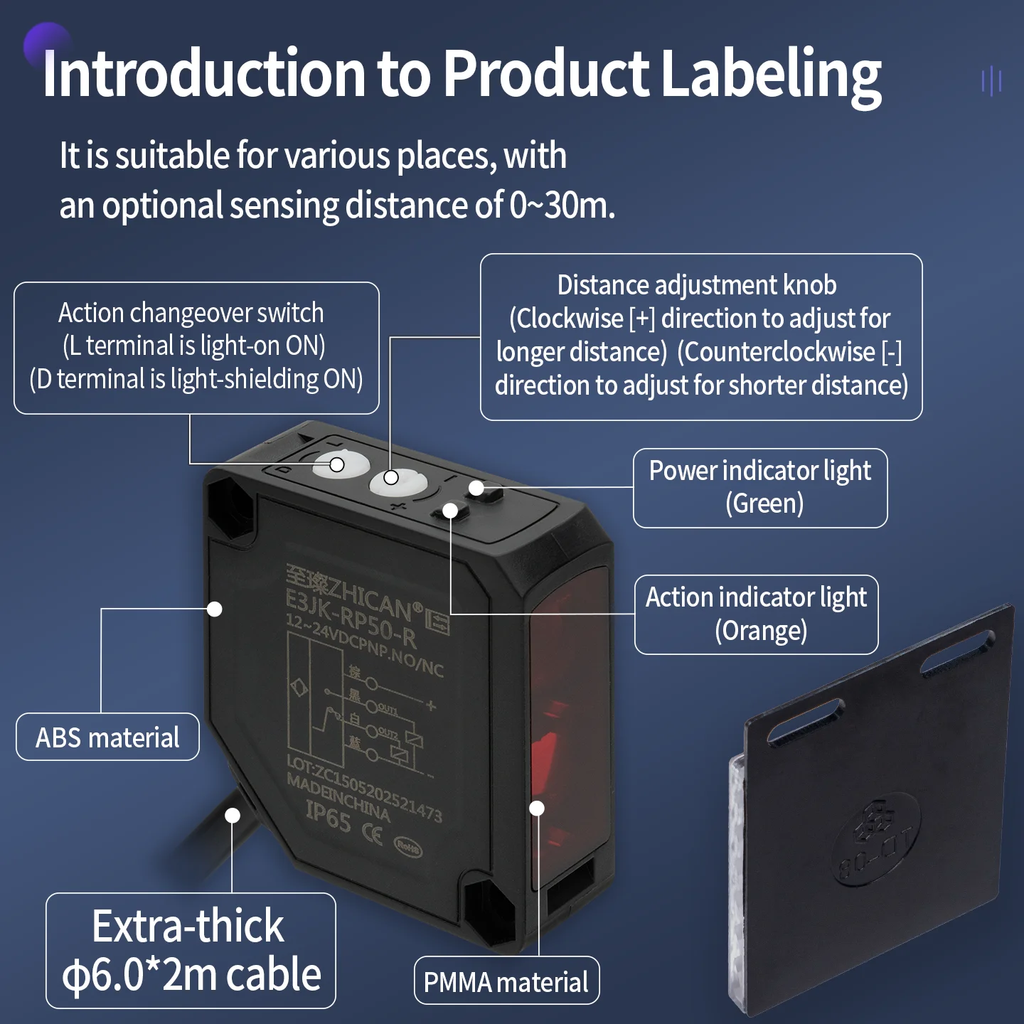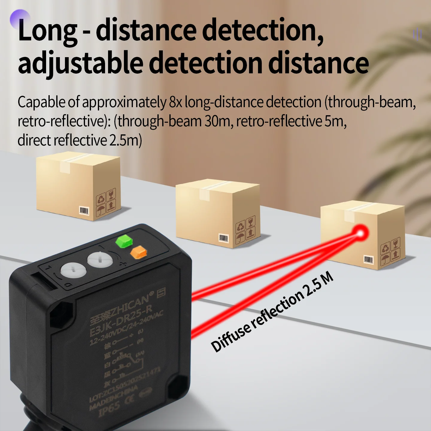 Sensore fotoelettrico quadrato largo 2,5 m a riflessione diffusa Zhican E3Jk-Rr12/Dr11 Distanza regolabile per il riflessione dello specchio